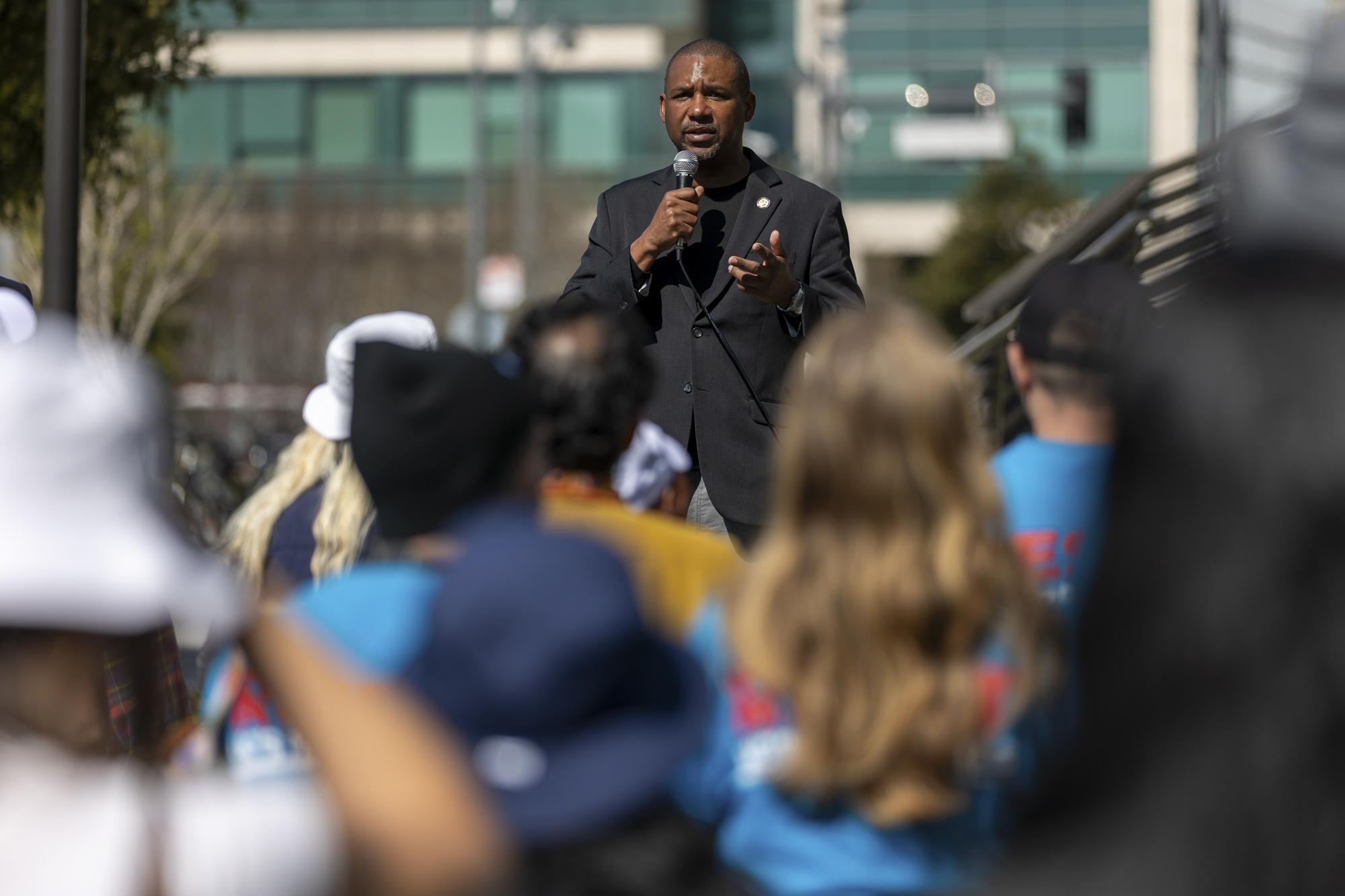 San Francisco Supervisor Shamann Walton speaks to workers and union members gathered outside UCSF Medical Center at Mission Bay in San Francisco on March 5, 2026, during a rally demanding stronger safety protections for employees following the killing of social worker Alberto Rangel. (Gustavo Hernandez/KQED)