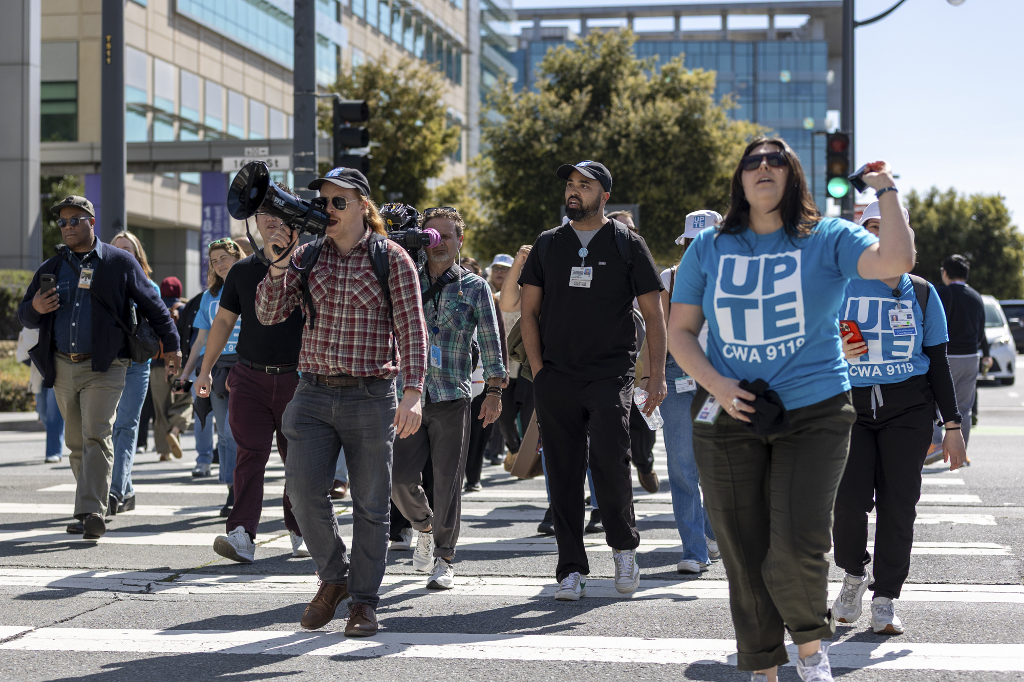 Union members and health care workers march toward UCSF Medical Center at Mission Bay in San Francisco on March 5, 2026, led by clinical pharmacist Matias Campos, to deliver safety demands to university leaders following the fatal stabbing of social worker Alberto Rangel. More than one in five social workers say they have been assaulted on the job, according to a recent union survey. (Gustavo Hernandez/KQED)