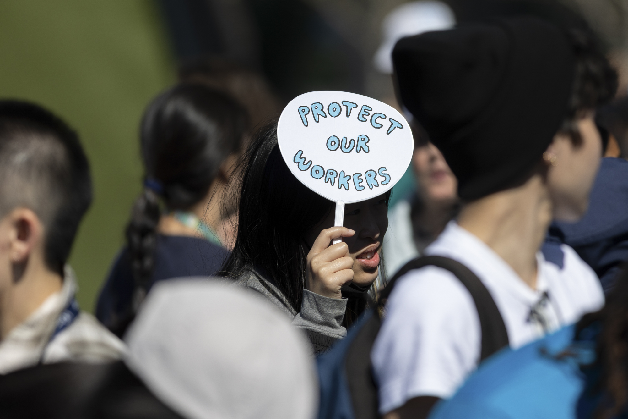 A supporter holds a sign reading “Protect Our Workers” during a rally outside UCSF Medical Center at Mission Bay in San Francisco on March 5, 2026, where union members gathered to demand stronger protections for health care workers following the fatal stabbing of social worker Alberto Rangel. (Gustavo Hernandez/KQED)