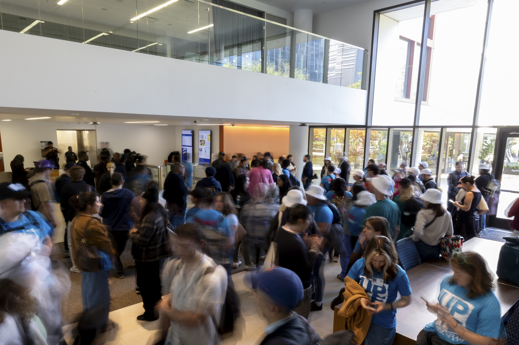 Dozens of union members and supporters gather inside UCSF Medical Center at Mission Bay in San Francisco on March 5, 2026, demanding stronger safety protections for employees following the fatal stabbing of social worker Alberto Rangel. (Gustavo Hernandez/KQED)