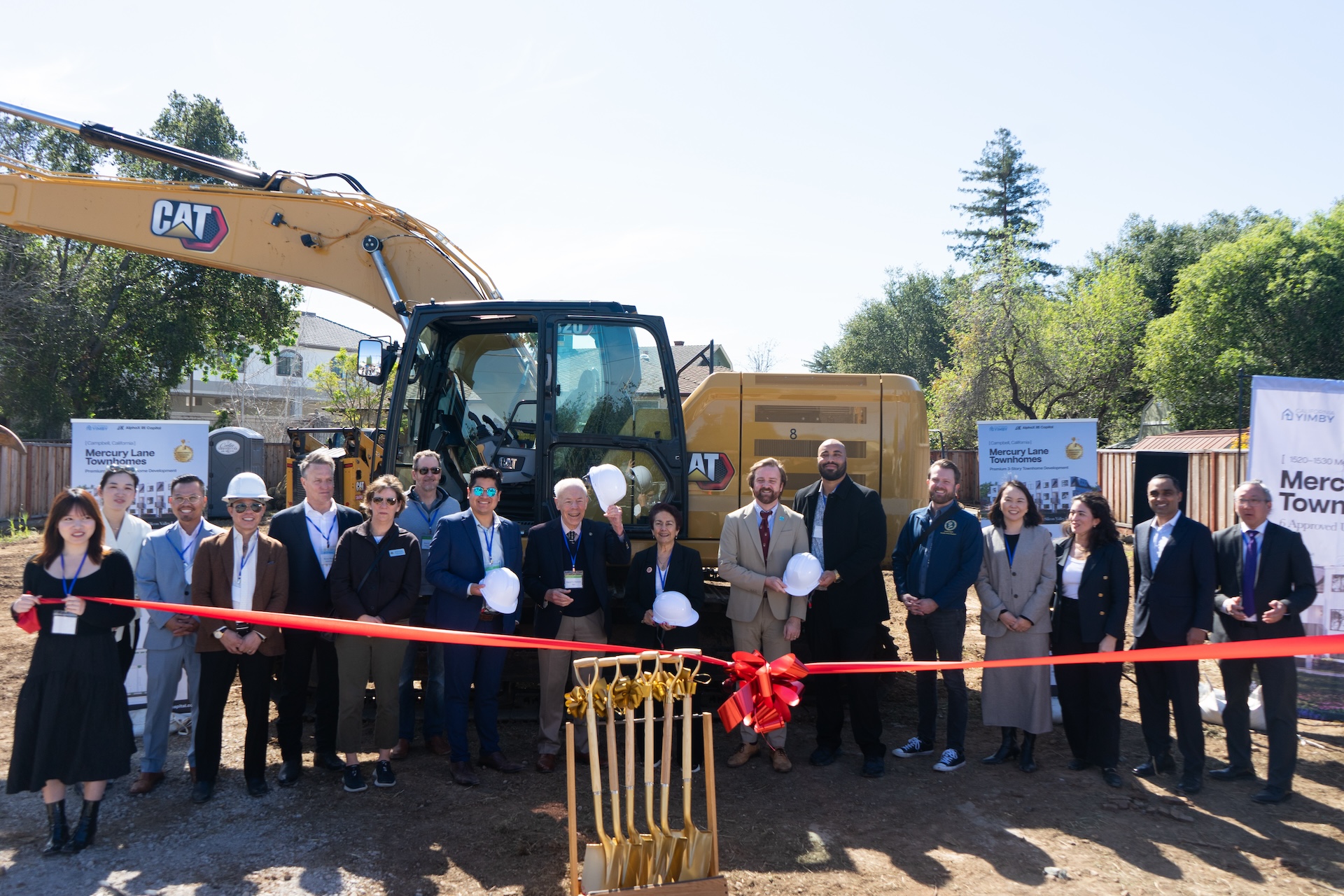 From left, Campbell Council member Sergio Lopez, Campbell Mayor Daniel Furtado, state Sen. Ana Caballero, Nolan Gray, senior director of legislation and research at California YIMBY, Muhammad Alameldin, senior policy advisor at California YIMBY, and representatives of AlphaX RE Capital attend the groundbreaking ceremony for Mercury Lane Townhomes in Campbell on Friday, March 6, 2026. The Silicon Valley groundbreaking marks potentially the first construction under a new law, promising middle-income families a faster track toward homeownership.