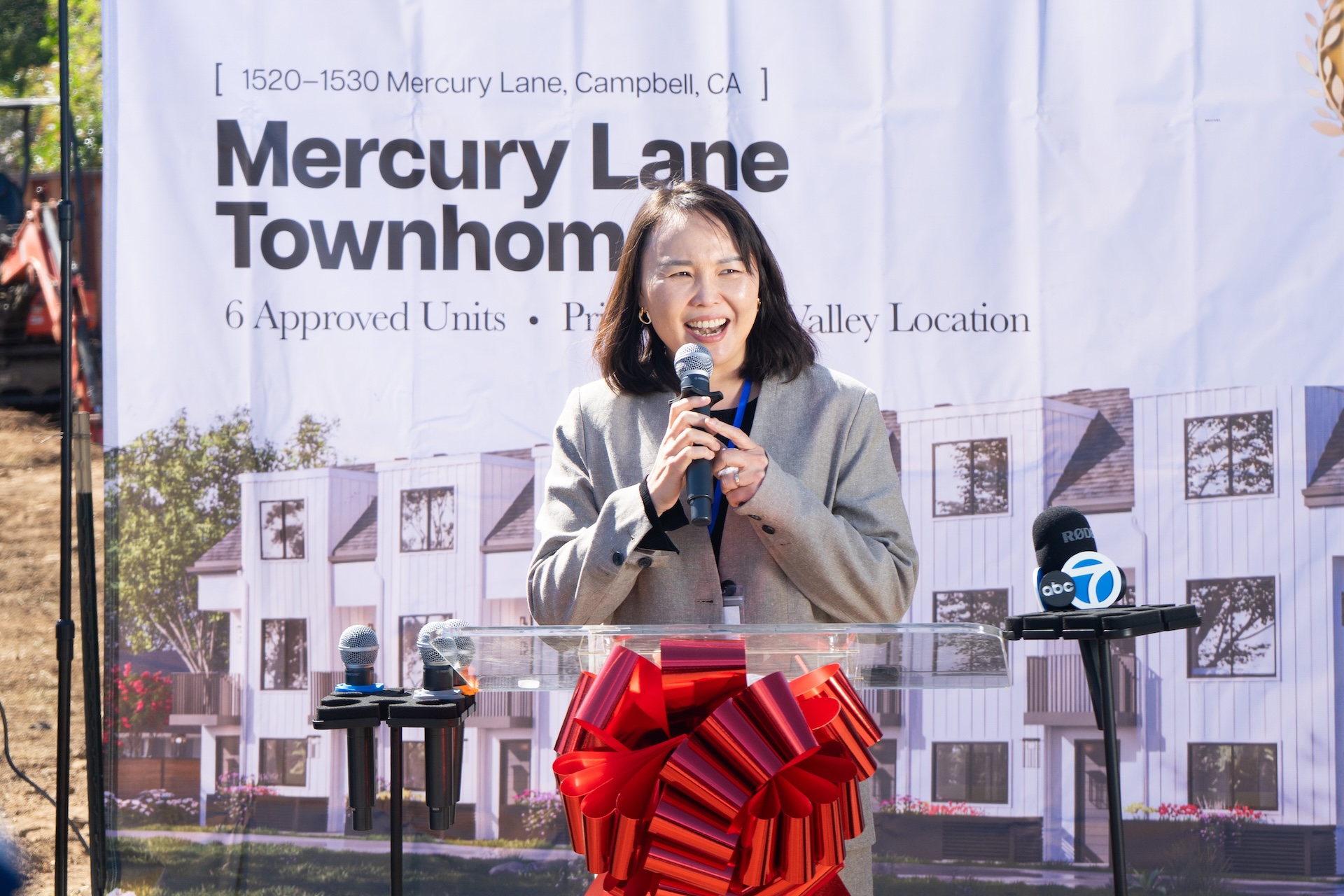 Stephanie Yi, founder and CEO of AlphaX RE Capital, speaks at the groundbreaking ceremony for Mercury Lane Townhomes in Campbell on Friday, March 6, 2026. (Courtesy of AlphaX RE Capital)
