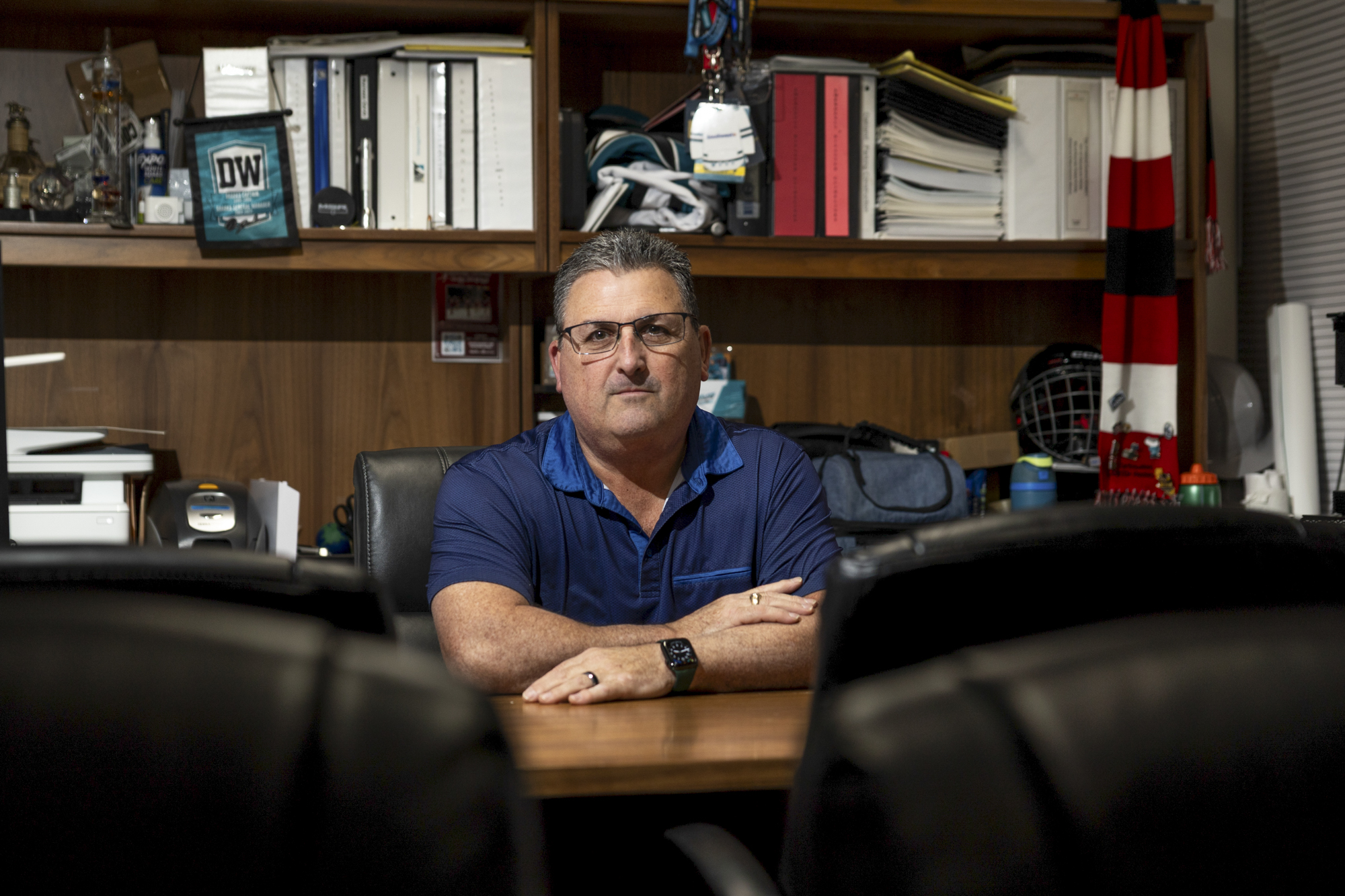 Glenn Martin, general manager of the Oakland Ice Center, sits in his office on March 10, 2026, in Oakland. Martin oversees the rink where Olympic champion Alysa Liu trained as a child and continues to practice today. (Gustavo Hernandez/KQED)