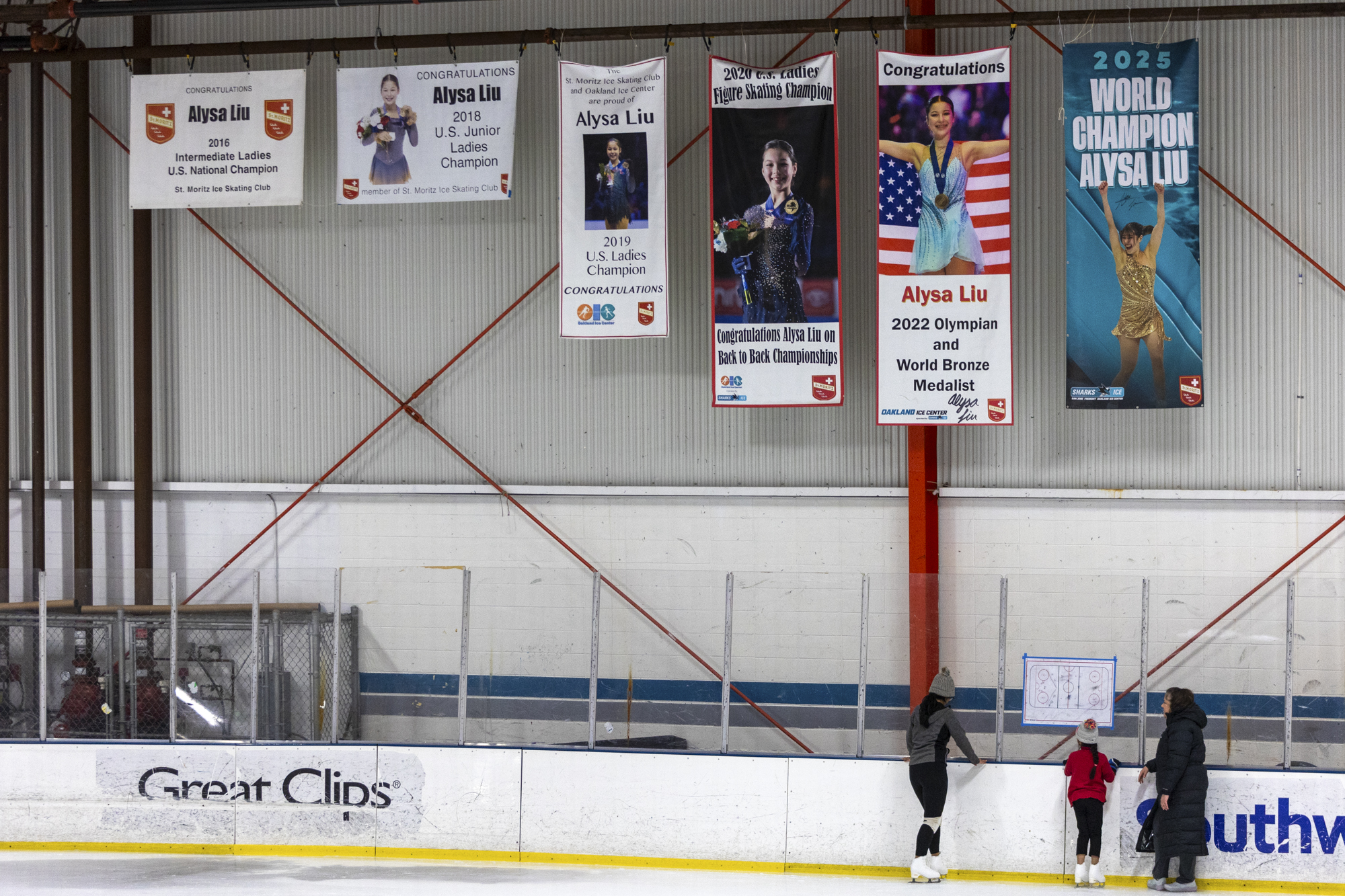 Banners celebrating Olympic champion Alysa Liu hang above the rink on March 10, 2026, at the Oakland Ice Center in Oakland. (Gustavo Hernandez/KQED)