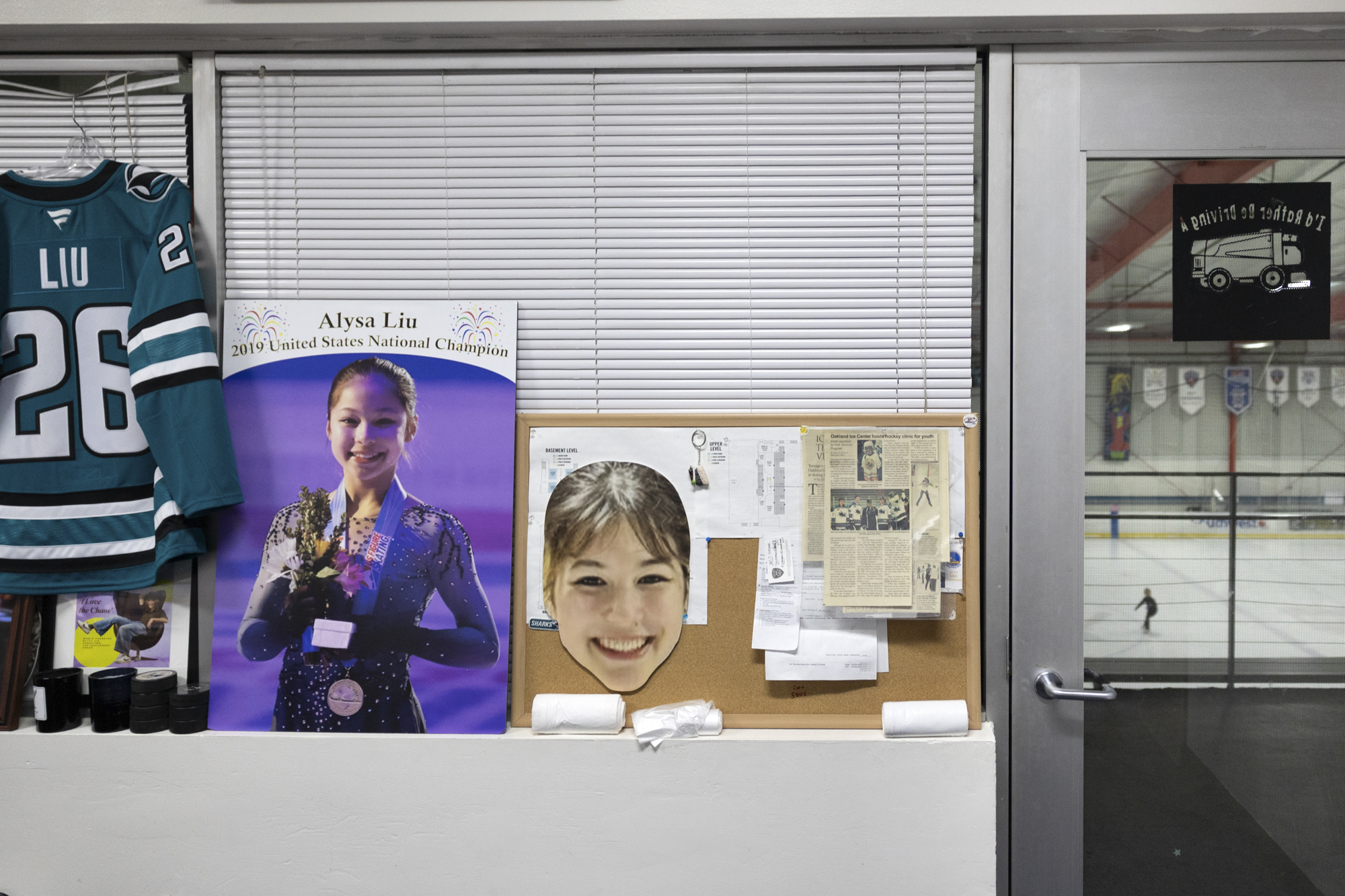 Memorabilia celebrating Olympic champion Alysa Liu hangs inside the Oakland Ice Center on March 10, 2026, in Oakland. (Gustavo Hernandez/KQED)
