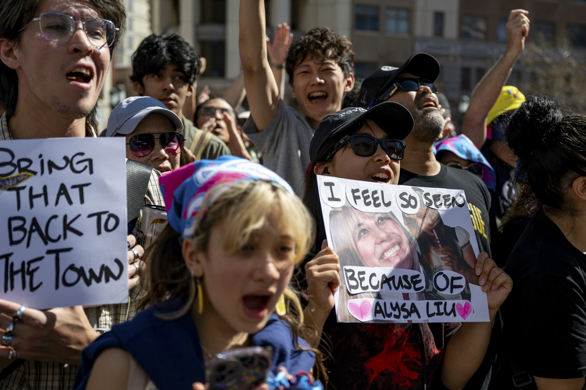 “We watched [Alysa’s performance] probably three times in a row,” Cynthia’s daughter, Jennifer, said from Thursday’s rally. She told KQED she and her five- and eight-year-old daughters teared up during the program. “My family, my girls, all of us have been really, really inspired and encouraged by what Alysa has done and her story. And so we just want to come out and support her and celebrate her.”