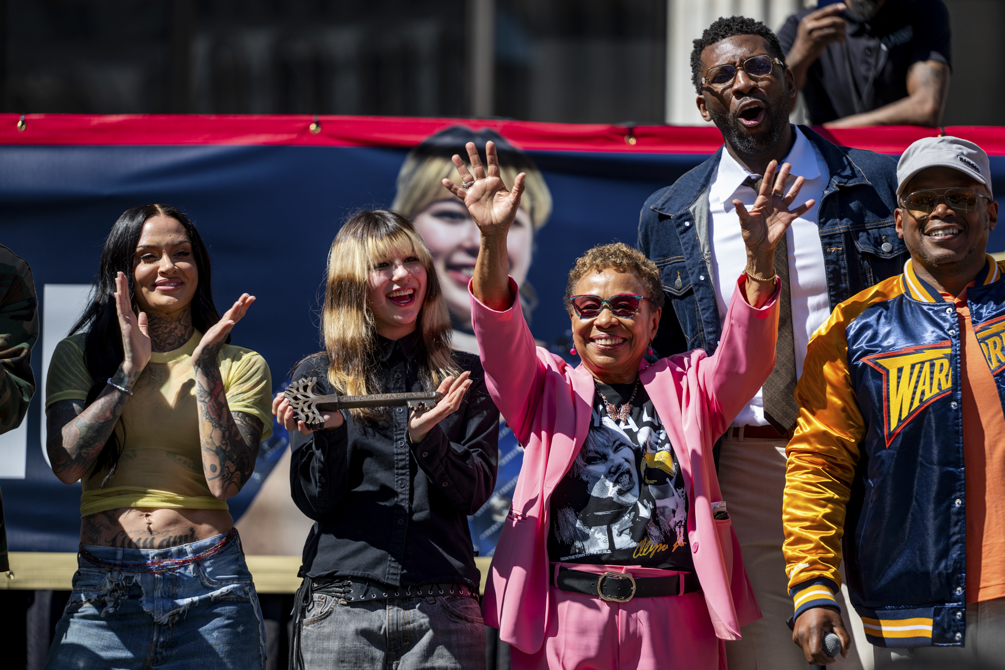 Kehlani, Olympic gold medalist Alysa Liu, mayor Barbara Lee, Sway Calloway stand on stage during a celebration in Liu’s honor at Frank Ogawa Plaza in Oakland on March 12, 2026. (Beth LaBerge/KQED)
