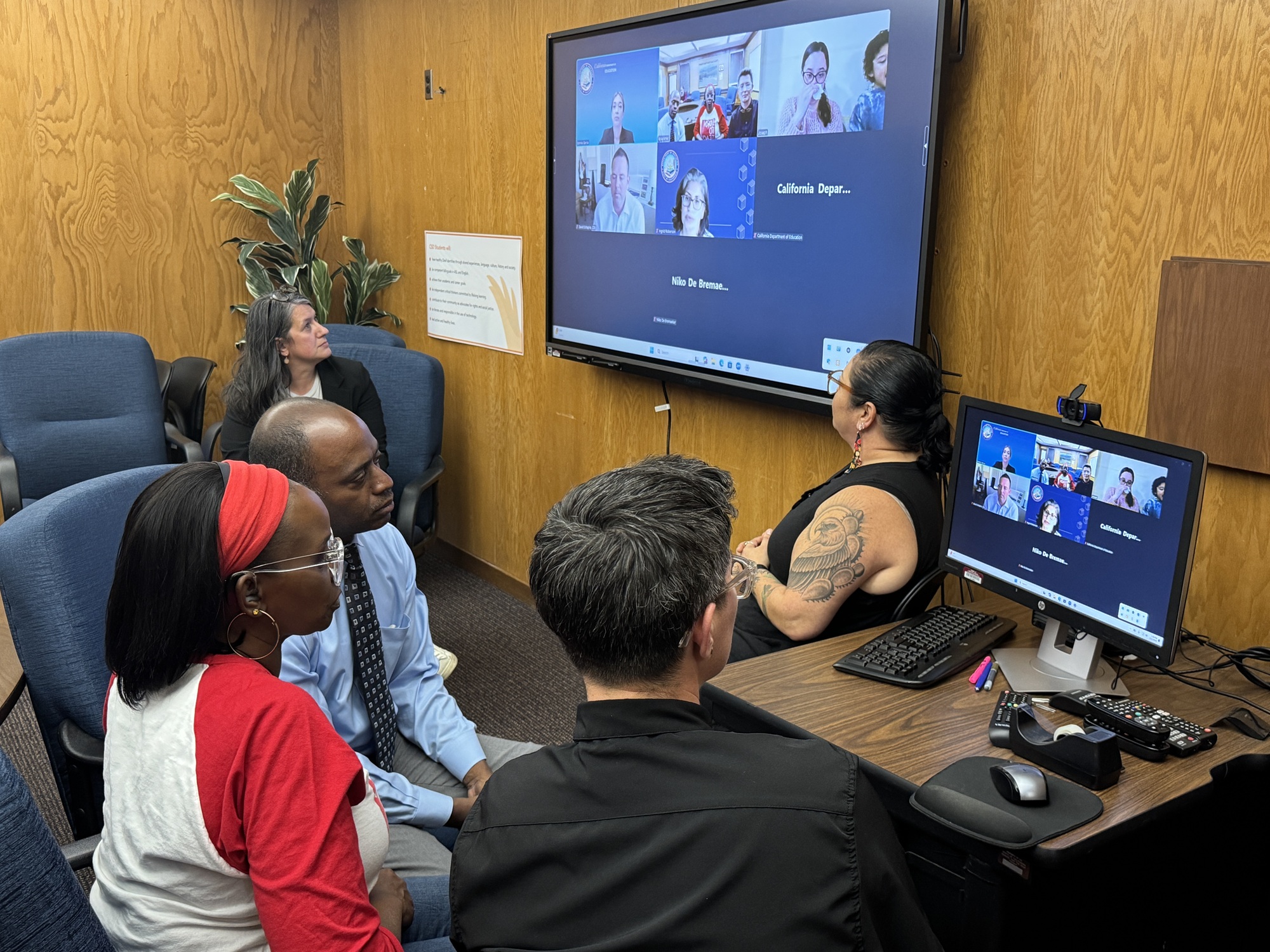 Staff at California School for the Deaf in Fremont meet virtually with Joseph Londono Rodriguez and his mother, Lesly Rodriguez Gutierrez, now in hiding in Colombia, on Thursday, March 12, 2026. From left are teacher Tanisha Cotton, Superintendent Amy Novotny, State Superintendent of Public Instruction Tony Thurmond, ASL interpreter Jacelia Washington and family educator Vanessa Sandez. Staff interpret in ASL and speak English and Spanish so everyone can communicate. Supt. Tony Thurmond told the Trump administration it’s “essential” that the 6-year-old boy return to the California School for the Deaf, as he faces health and learning risks in Colombia. (Courtesy of State Superintendent Tony Thurmond's Office)
