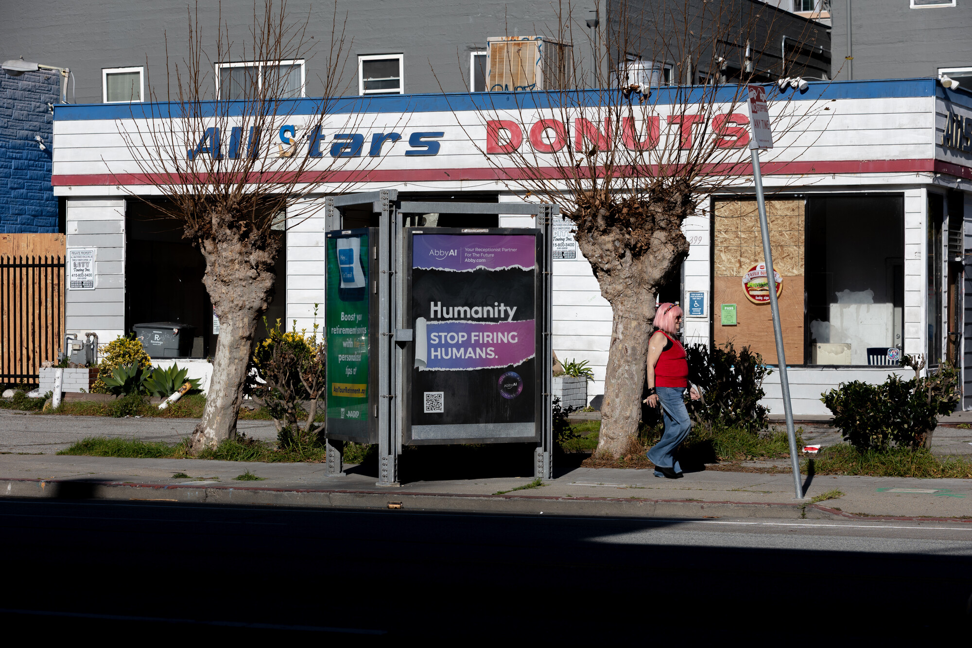 A woman walks past a bus shelter ad reading “Humanity. Stop firing humans.” in front of a boarded storefront at Fifth and Harrison streets on Feb. 2, 2026, in San Francisco. (Gustavo Hernandez/KQED)