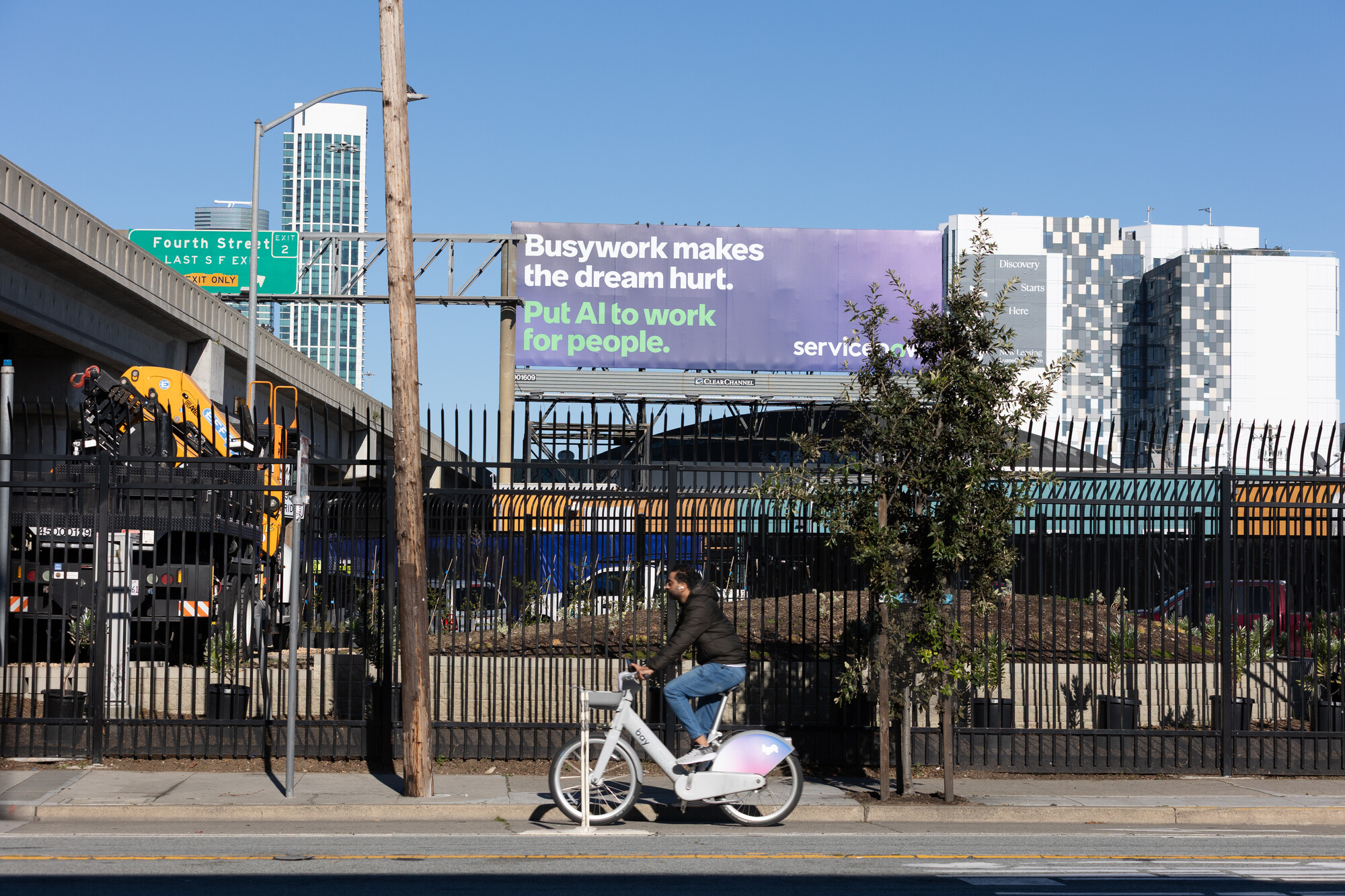 A cyclist rides along Fifth Street beneath a tech billboard on Feb. 2, 2026, in San Francisco. (Gustavo Hernandez/KQED)