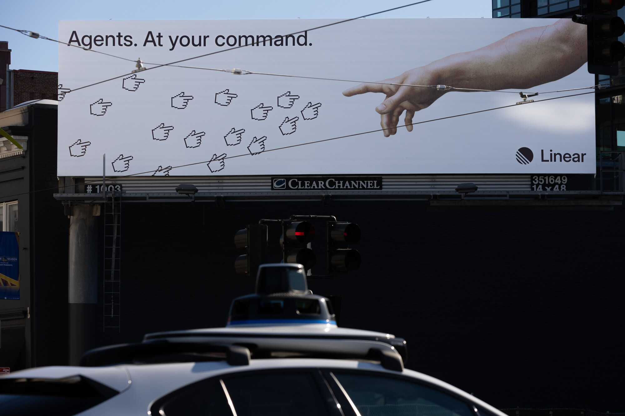 Linear, a San Francisco-based company, took one of the most recognizable images in Western civilization — Michelangelo’s The Creation of Adam — and instead of God reaching towards Adam, God’s hand now approaches a cluster of tiny cursor hands. Below, a message reads, “Agents. At your command.”