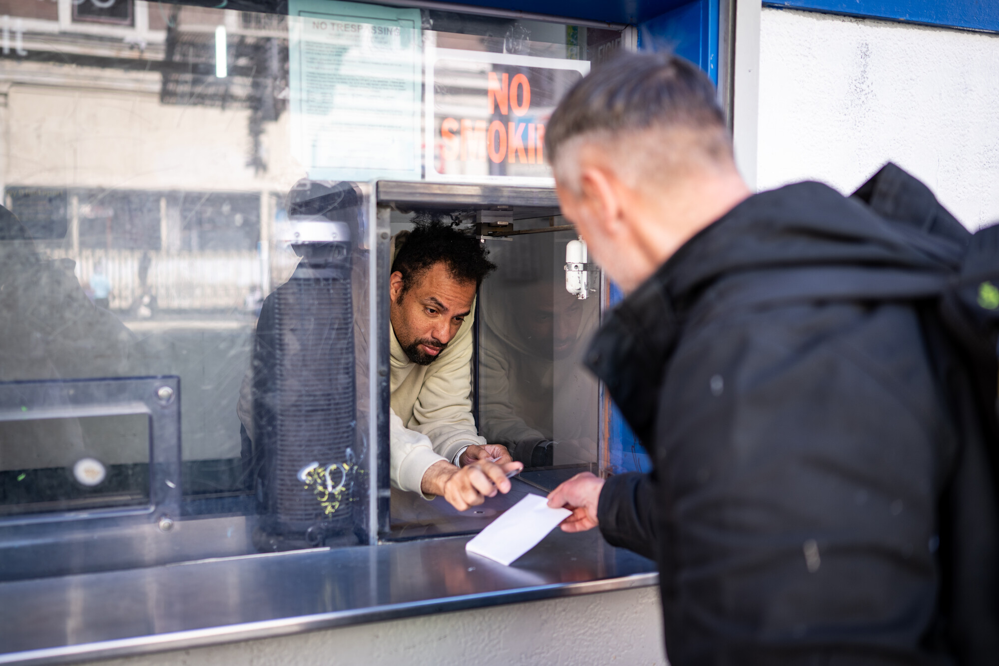 General Delivery is a free service. To get their mail, patrons slip their IDs through a small hole in the thick plexiglass window. A USPS clerk inside searches for their mail and delivers stacks of letters and packages through a small, transparent door on one side of the window.