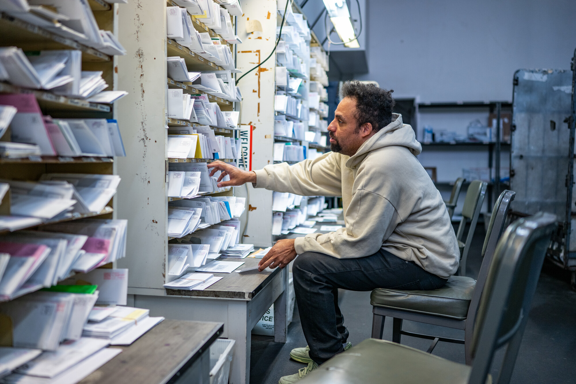 USPS employee Robert Tapia works at San Francisco General Delivery on March 10, 2026. The service allows people without a permanent address to receive mail by picking it up at the post office. (Beth LaBerge/KQED)