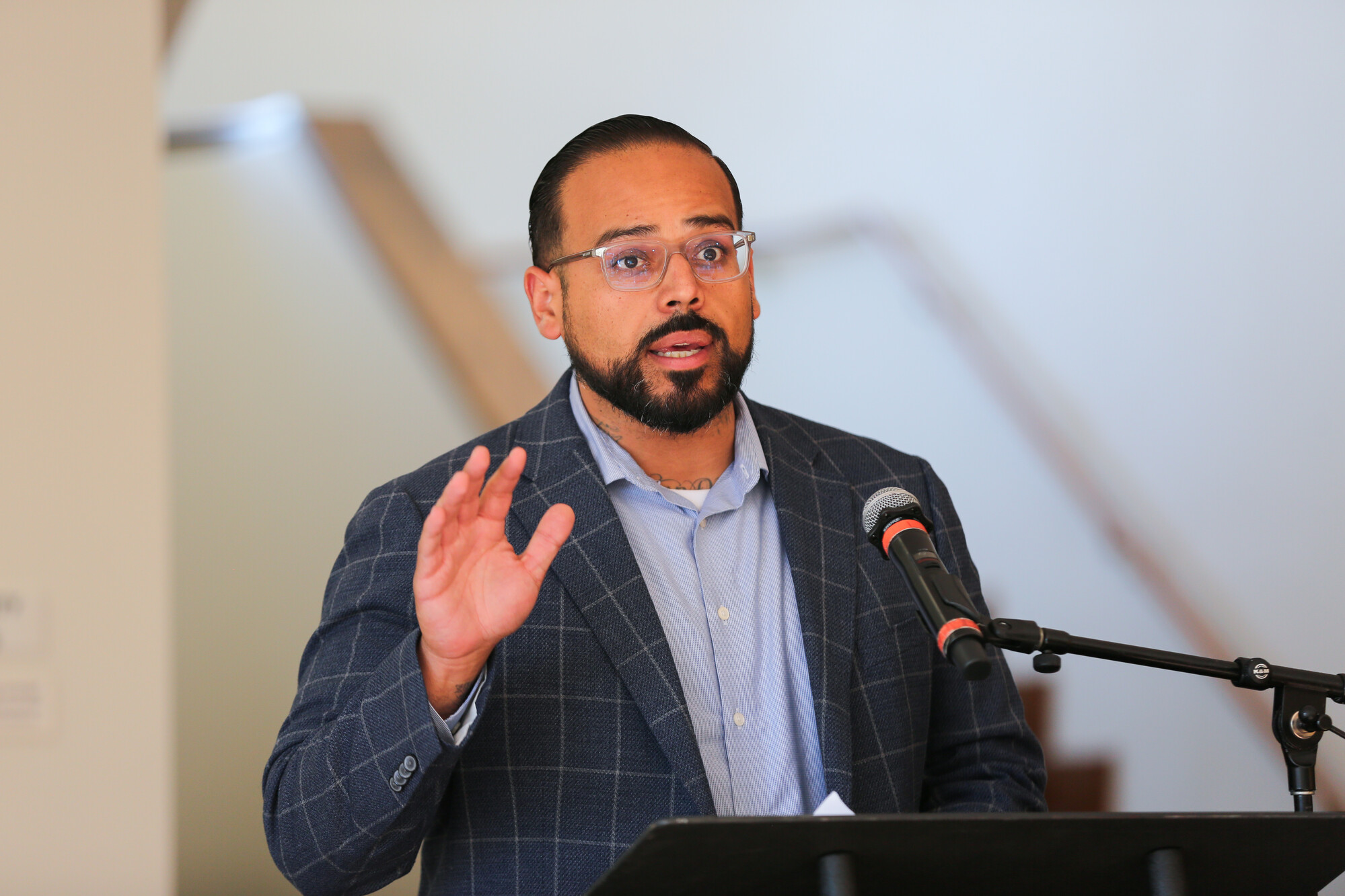 District 5 San José City Councilmember Peter Ortiz speaks on March 19, 2026, about the city’s plans to review public spaces that bear the name or image of Cesar Chavez, in the wake of the sexual abuse allegations against the late labor leader. (Joseph Geha/KQED)