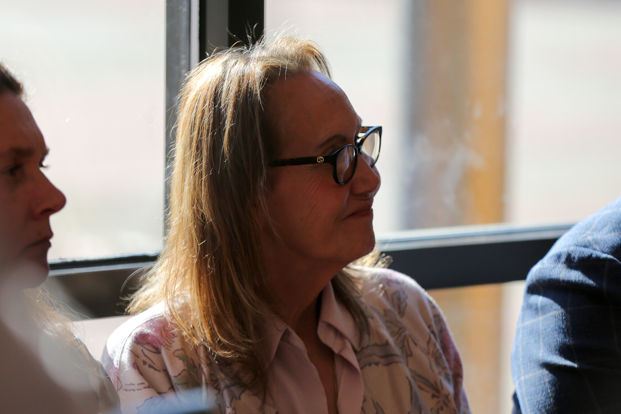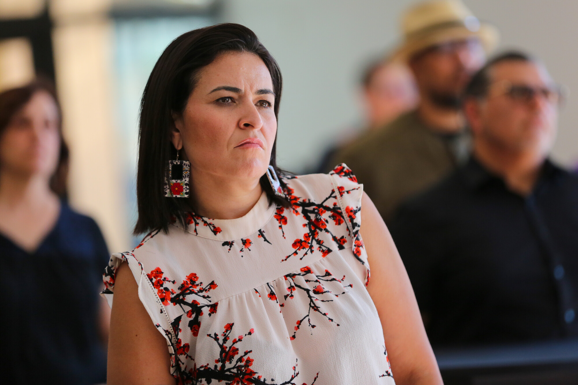 Gabriela Chavez-Lopez, executive director of the Latina Coalition of Silicon Valley, listens during a gathering at Mexican Heritage Plaza in East San José on Thursday, March 19, 2026. (Joseph Geha/KQED)