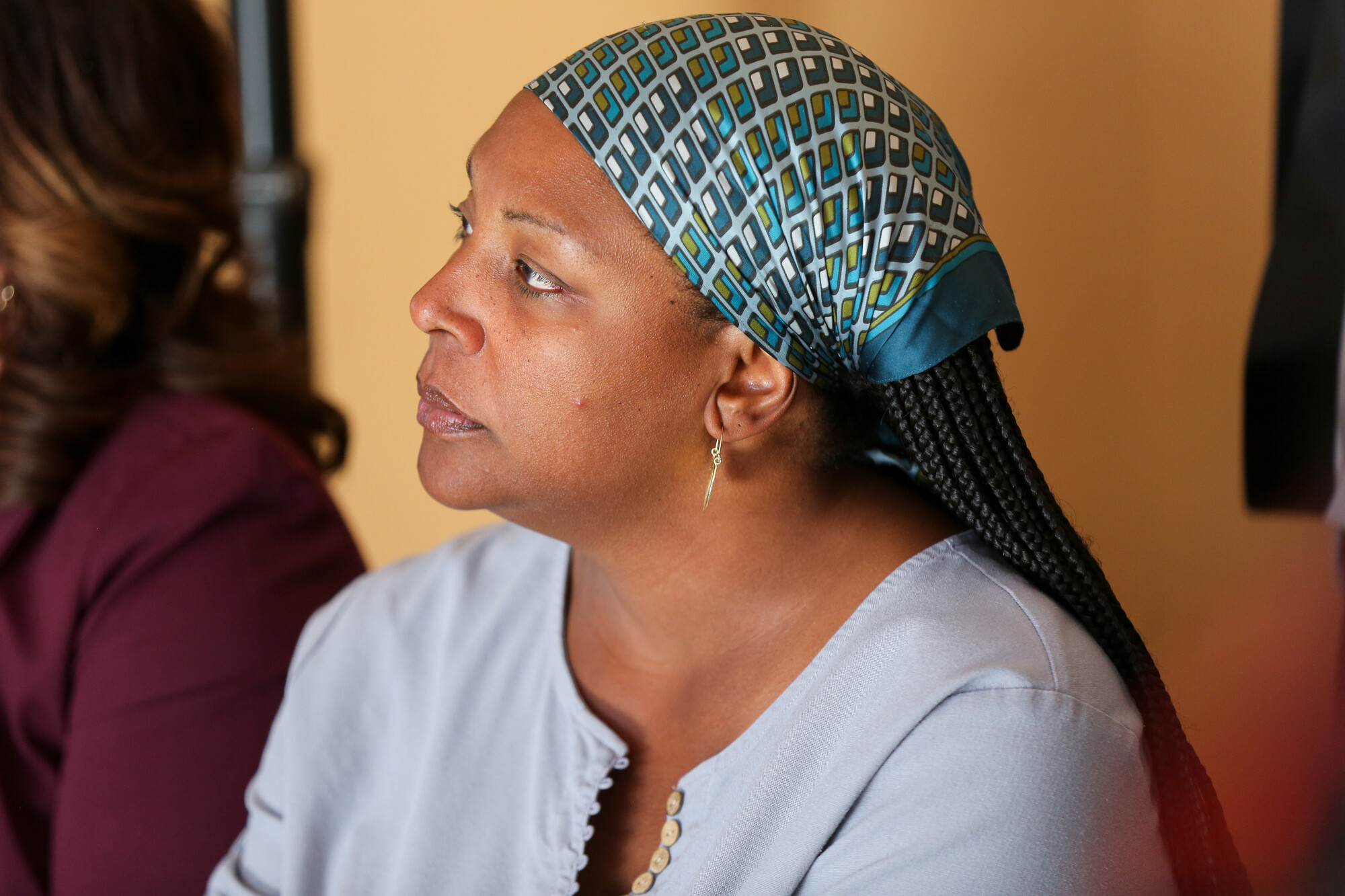 Maritza Maldonado, the executive director of Amigos de Guadalupe in San José, listens during a community gathering to respond to the sexual abuse allegations against the late labor leader Cesar Chavez on Thursday, March 19, 2026. (Joseph Geha/KQED)