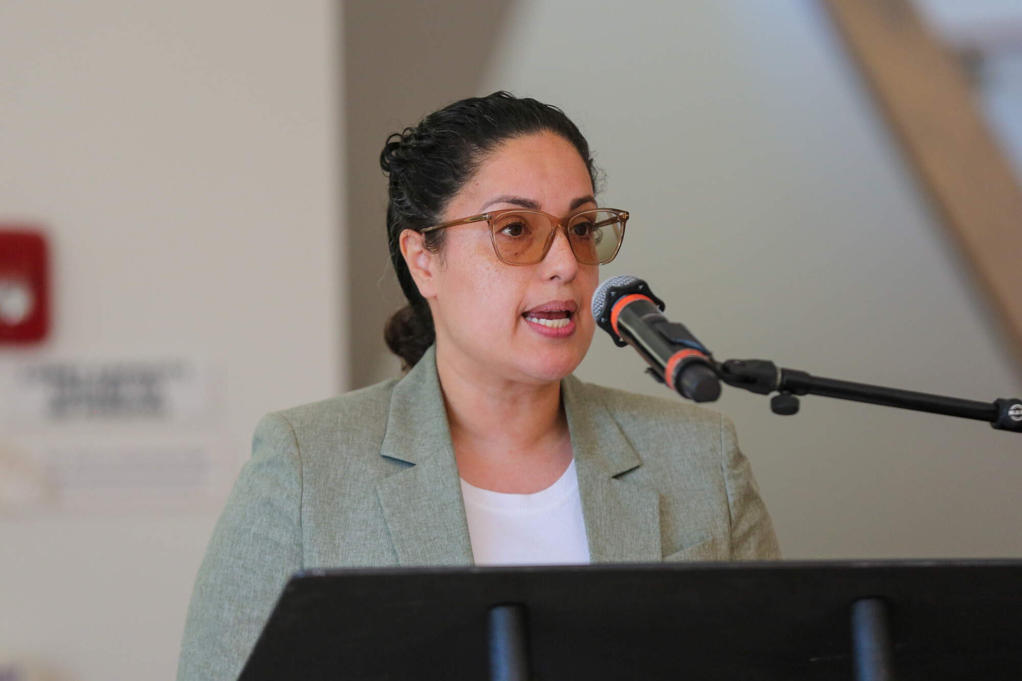 Colsaria Henderson, executive director of Next Door Solutions to Domestic Violence, is seen during a community gathering at Mexican Heritage Plaza in East San José on Thursday, March 19, 2026. (Joseph Geha/KQED)