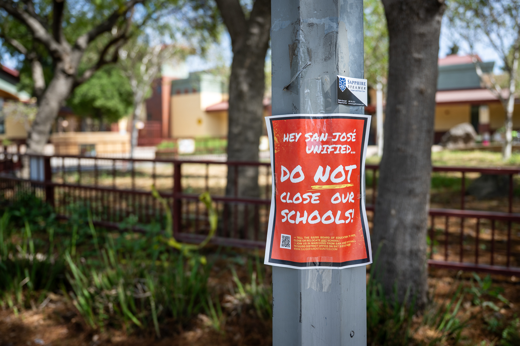 A sign says, "Do Not Close Our Schools" outside Hammer Montessori Elementary School in San José on March 26, 2026. Parents' legal challenge comes ahead of a vote on the San José Unified School District's closure plan at a Thursday evening school board meeting. (Beth LaBerge/KQED)