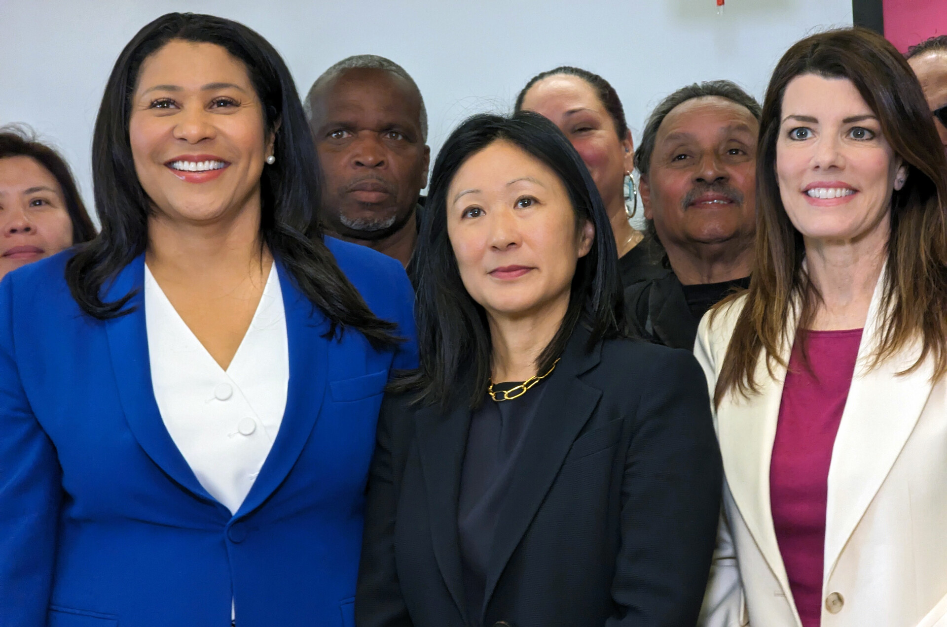 Ivy Lee (center), flanked by San Francisco Mayor London Breed (left) and Supervisor Catherine Stefani, was announced as director of the city’s new Office of Victim and Witness Rights at a press conference in the West Portal neighborhood on May 28. (Joe Fitzgerald Rodriguez/KQED)