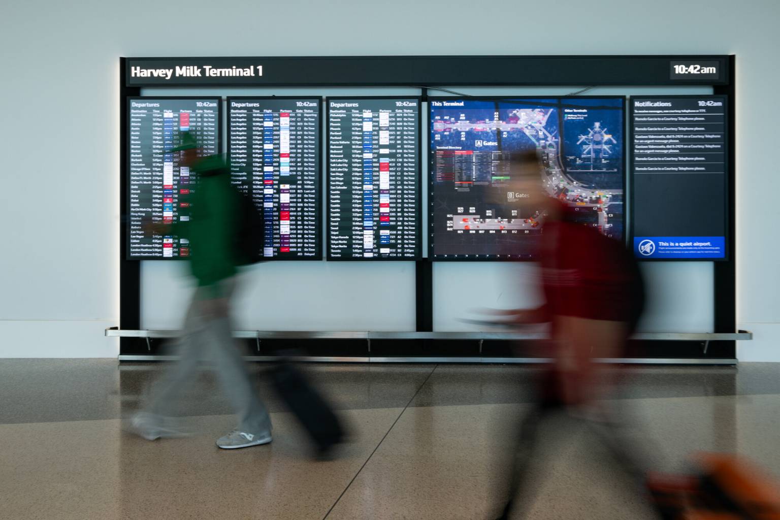 Unos pasajeros pasan junto a un panel de información de vuelos en la Terminal 1 “Harvey Milk” del Aeropuerto Internacional de San Francisco el 10 de diciembre de 2025. (Beth LaBerge/KQED)