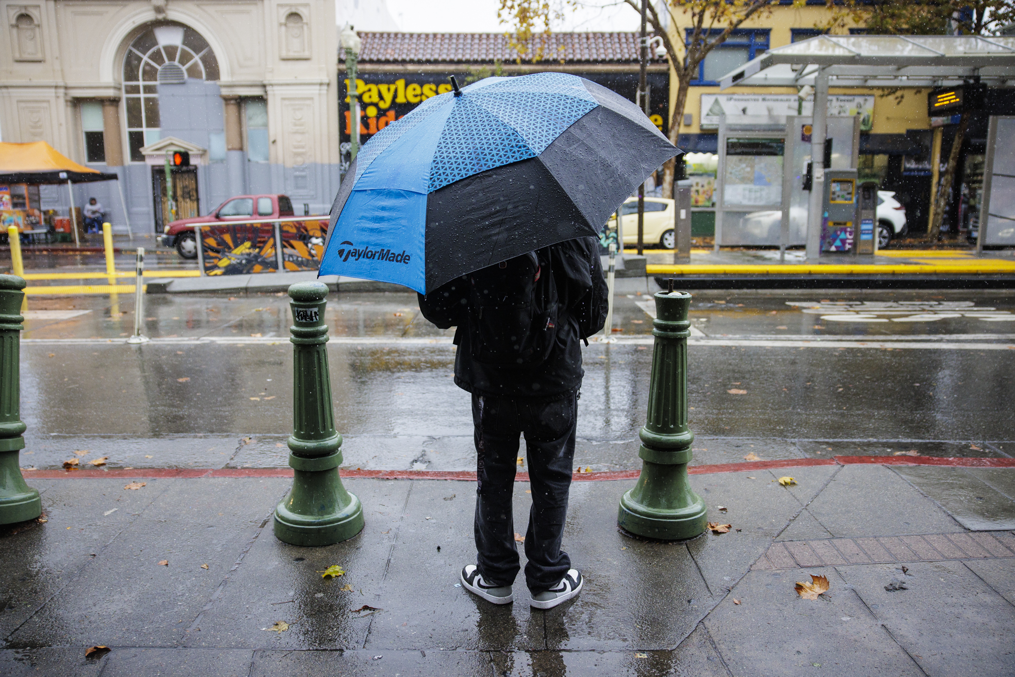 A person waits to cross the street in the Fruitvale neighborhood of Oakland on Nov. 13, 2025. (Martin do Nascimento/KQED)
