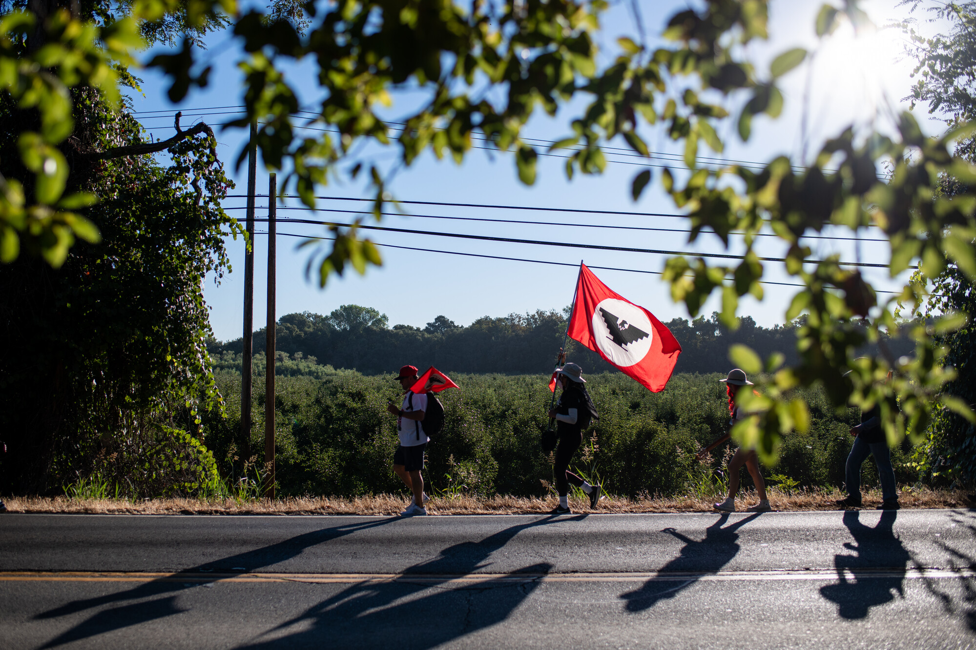 United Farm Workers and their supporters march through Walnut Grove on Day 22 of a 24-day “March for the Governor’s Signature” on Wednesday, Aug. 24, 2022, to convince Gov. Gavin Newsom to sign Assembly Bill 2183, the Agricultural Labor Relations Voting Choice Act. The march started in the Central Valley and will conclude with a rally in Sacramento on Aug. 26, 2022. (Beth LaBerge/KQED)