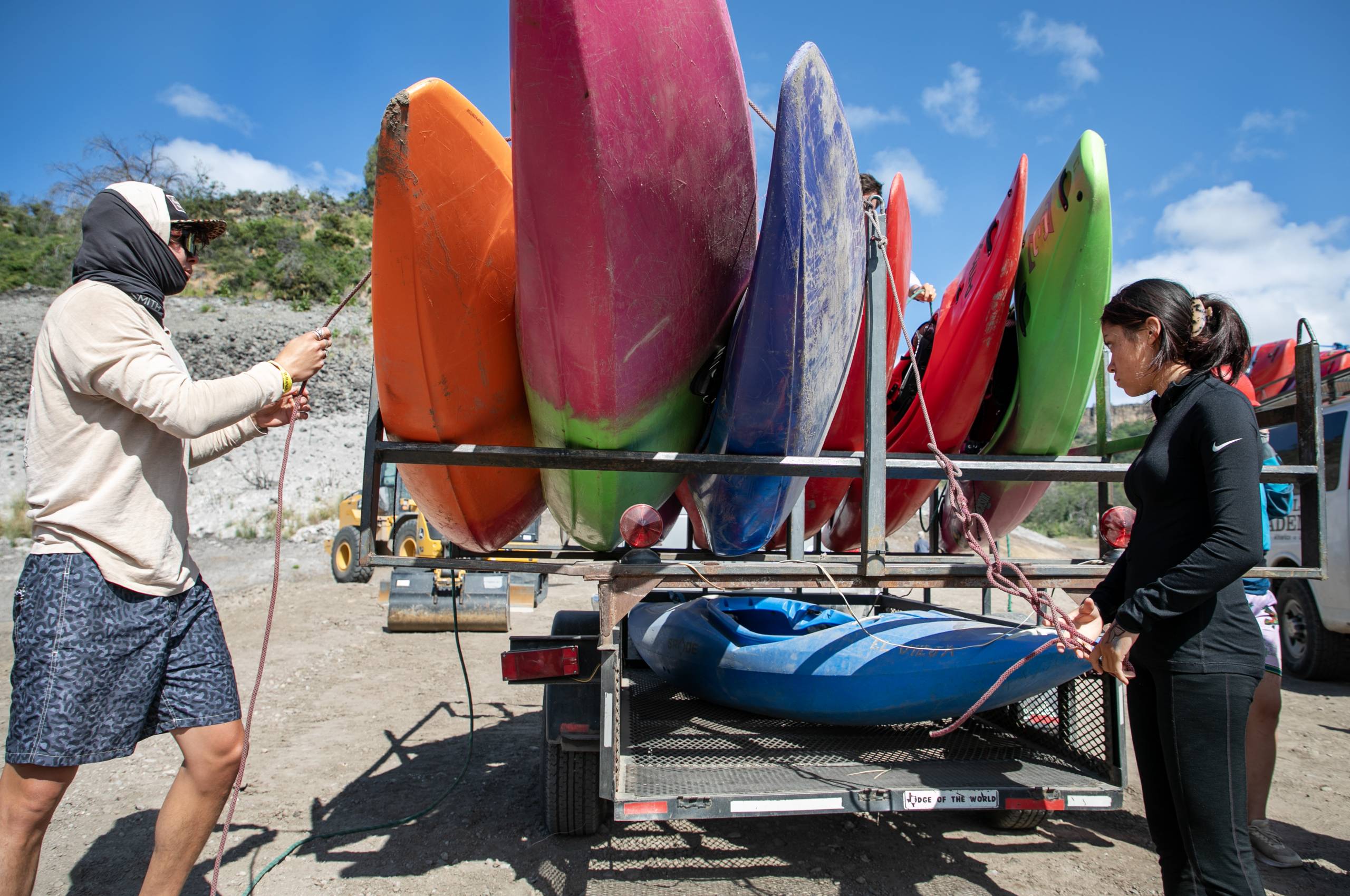 From left, Paddle Tribal Waters instructor Jaren Roberson, who is Hopi and Navajo, unloads boats on the banks of the Klamath River with participant Tasia Linwood, who has Karuk, Okanagan, Ojibwe, and Wampanoag ancestry, June 22, 2025. (Courtesy of Anna Lueck/OPB)