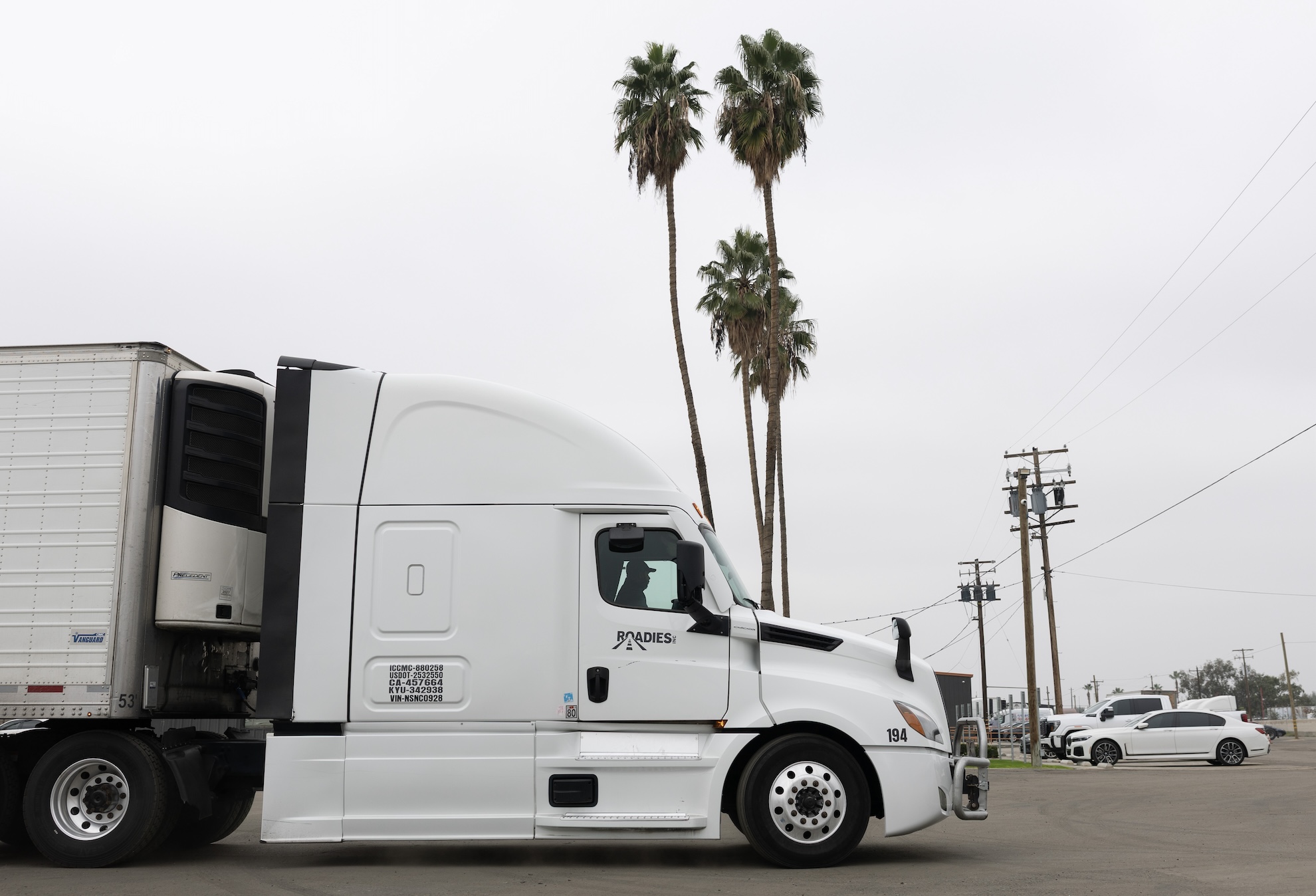A truck leaves for a delivery at Roadies Inc. in Bakersfield, CA on Saturday, Nov. 29, 2025. Avie Nagra, the CEO, says the license pause will affect about 100 of his 300 drivers. A California judge said she will oversee the DMV until it reissues corrected licenses to about 13,000 drivers, as federal actions threaten to push thousands of immigrant truck and bus drivers out of jobs. (Myung J. Chun/Los Angeles Times)