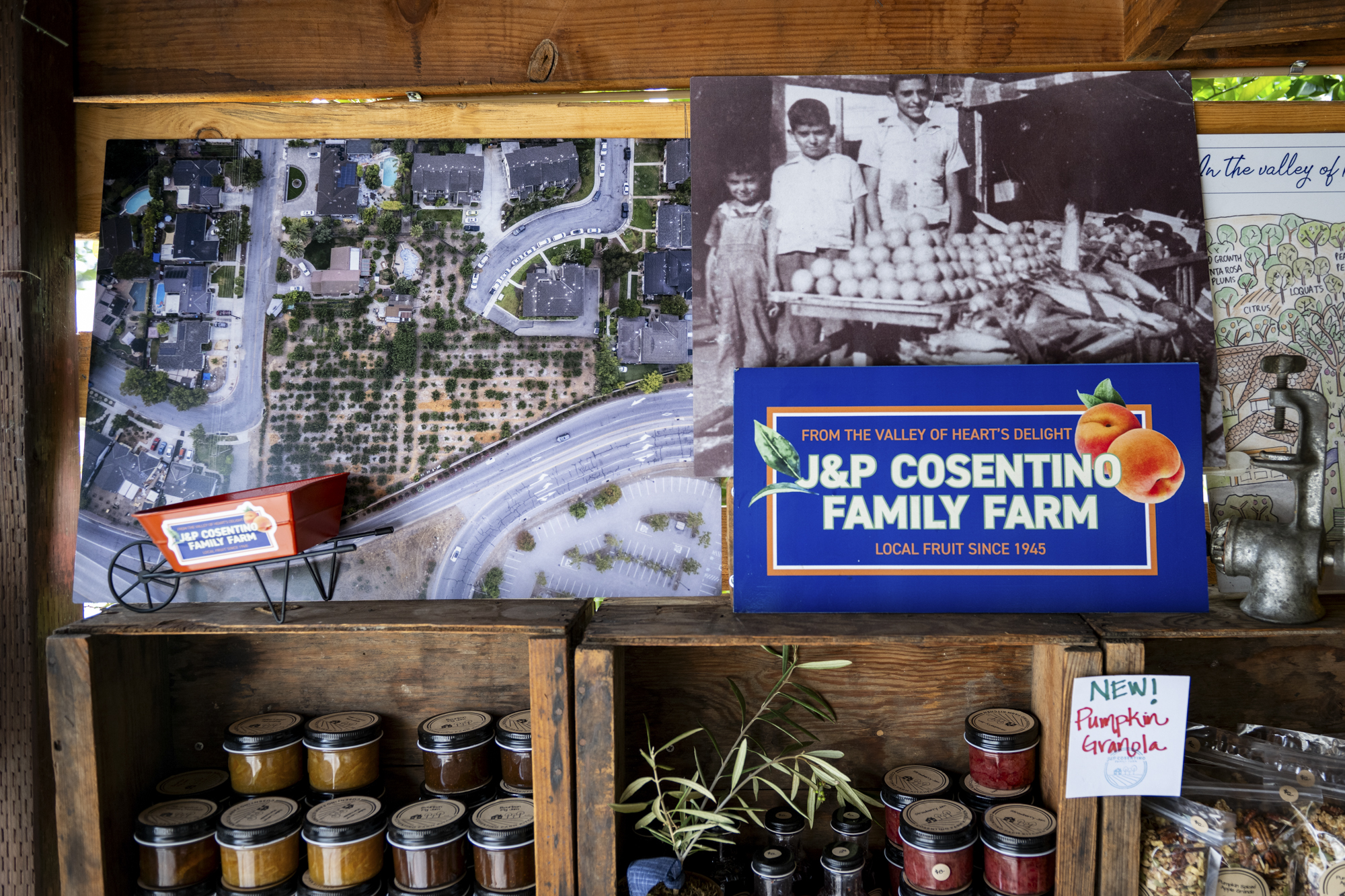 A drone photo of the farm and a family photo hang on the wall at J&P Cosentino Family Farm in San José on Oct. 17, 2023. (Beth LaBerge/KQED)
