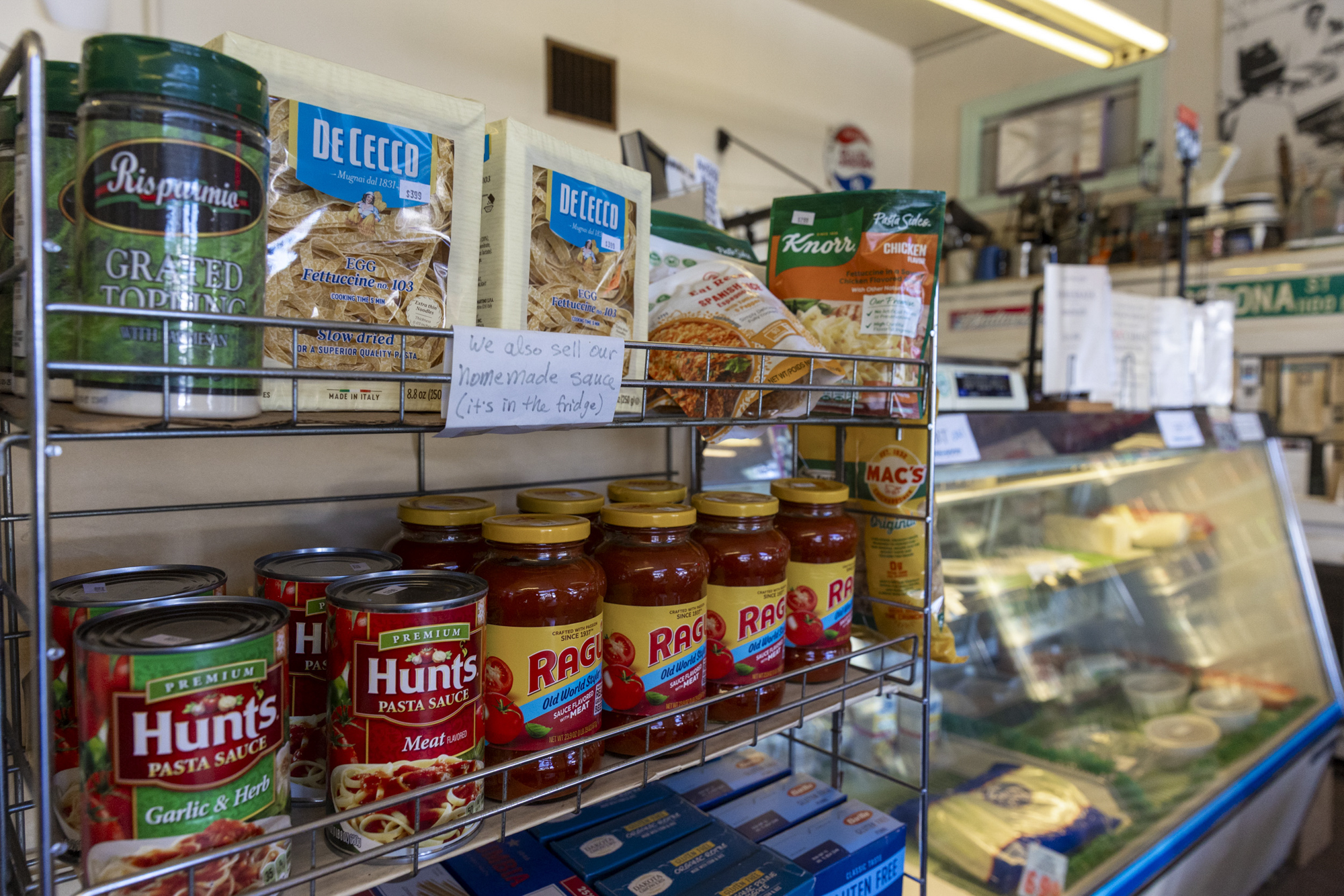 Dried pasta and sauce are sold at Chiaramonte’s Deli & Sausages in San José on March 7, 2026. (Tâm Vũ/KQED)