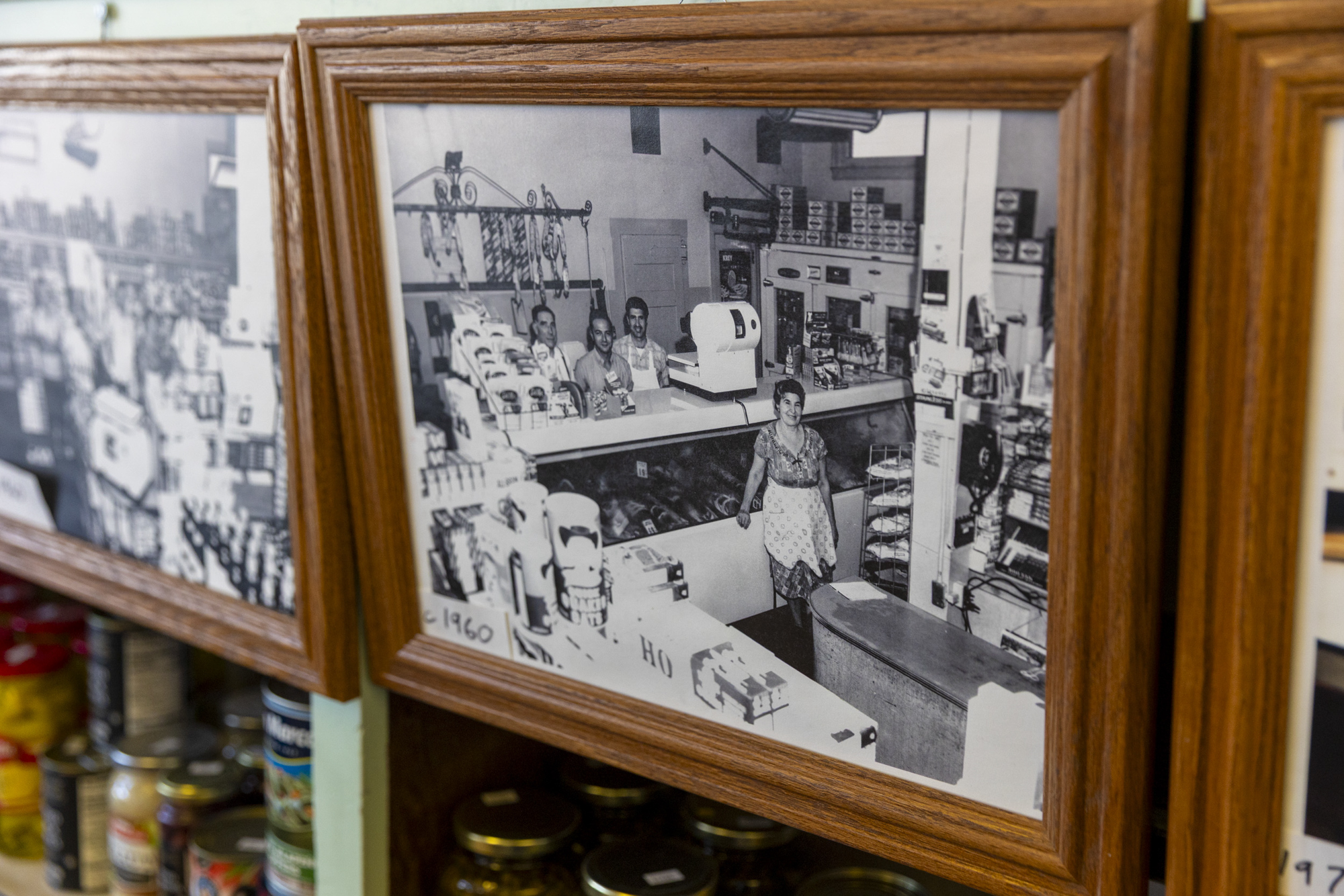 Old photos of Chiaramonte’s Deli & Sausages from the 1920s and onward are hung on a shelf at Chiaramonte’s Deli & Sausages in San José on March 7, 2026. (Tâm Vũ/KQED)
