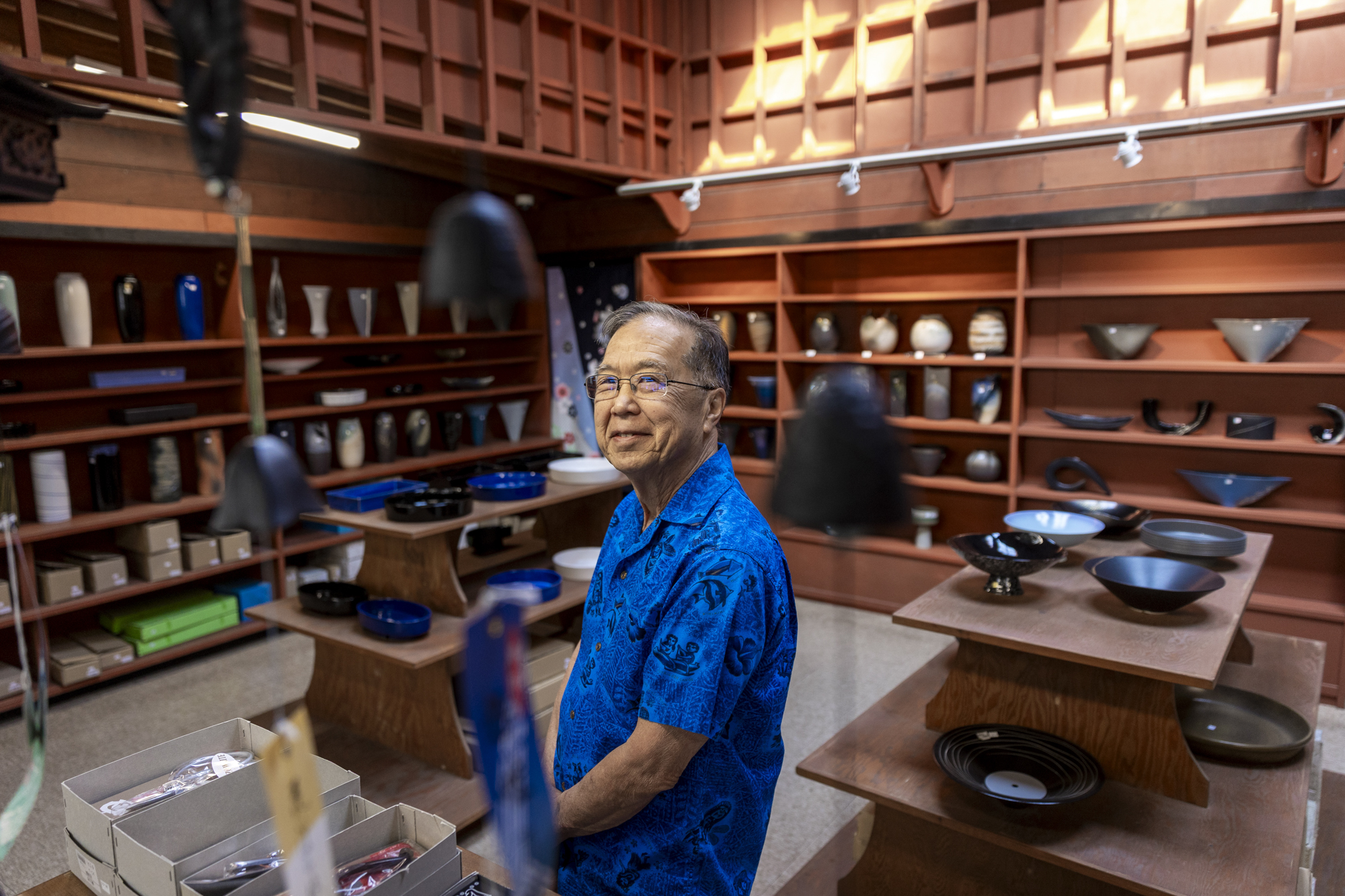 Richard Kogura, a third-generation resident of Japantown and co-owner of Kogura Company, poses for a portrait at Kogura Company in San José on March 20, 2026. (Tâm Vũ/KQED)