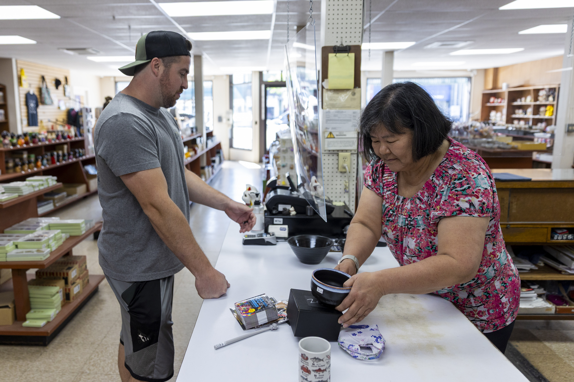 Carolyn Kogura (center right), a third-generation resident of Japantown and co-owner of Kogura Company, helps customer Nick Marozick (left) at the cash register at Kogura Company in San José on March 20, 2026. (Tâm Vũ/KQED)