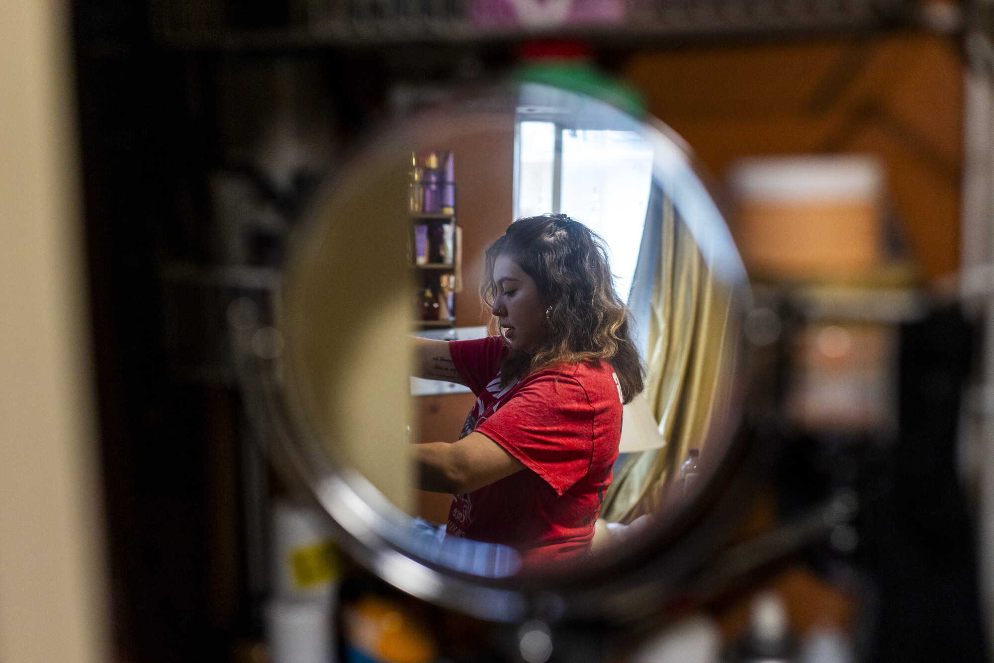 Kassandra Gutierrez, a single mother, gets ready at her mother’s home in Oakland on April 6, 2026. (Tâm Vũ/KQED)
