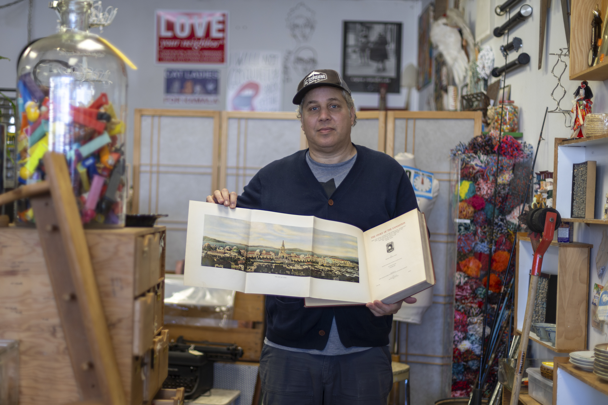 Jacques Lafontant, a frequent patron of Free Oakland UP and Oakland resident, holds a copy of his favorite book, “The Story of the Exposition,” inside the store in Oakland on Jan. 24, 2026. (Gustavo Hernandez/KQED)