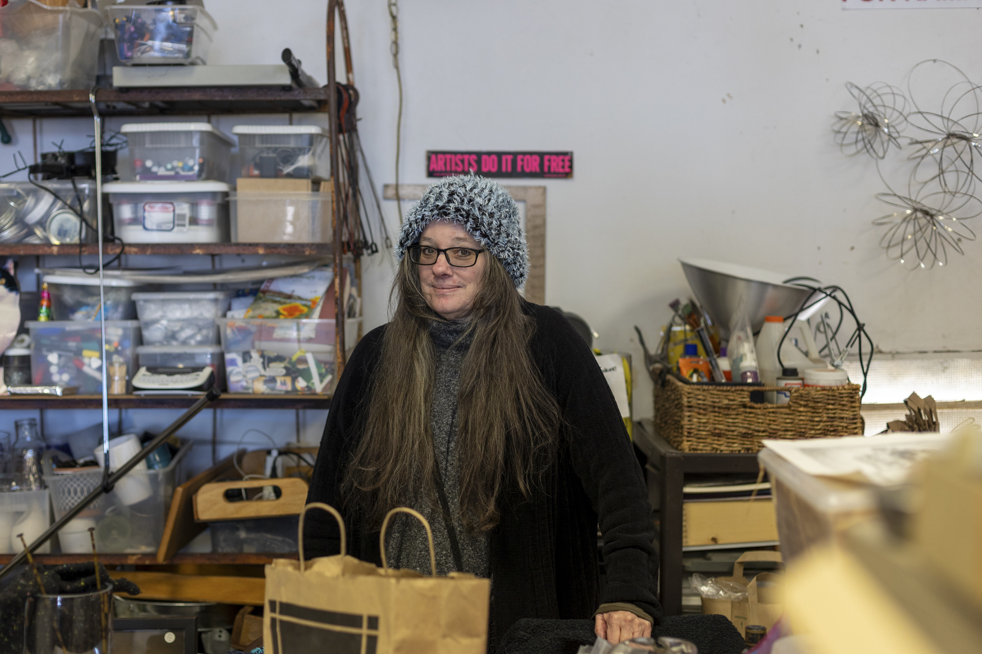 Jocelyn Meggait, the creator of Free Oakland UP, poses inside the store where donated items are sorted and future art projects are developed in Oakland on Jan. 24, 2026. (Gustavo Hernandez/KQED)