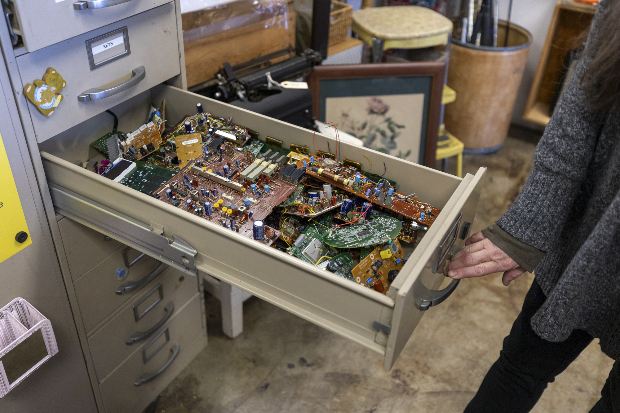 A repurposed filing cabinet holds old circuit boards at Free Oakland UP in Oakland on Jan. 24, 2026. (Gustavo Hernandez/KQED)