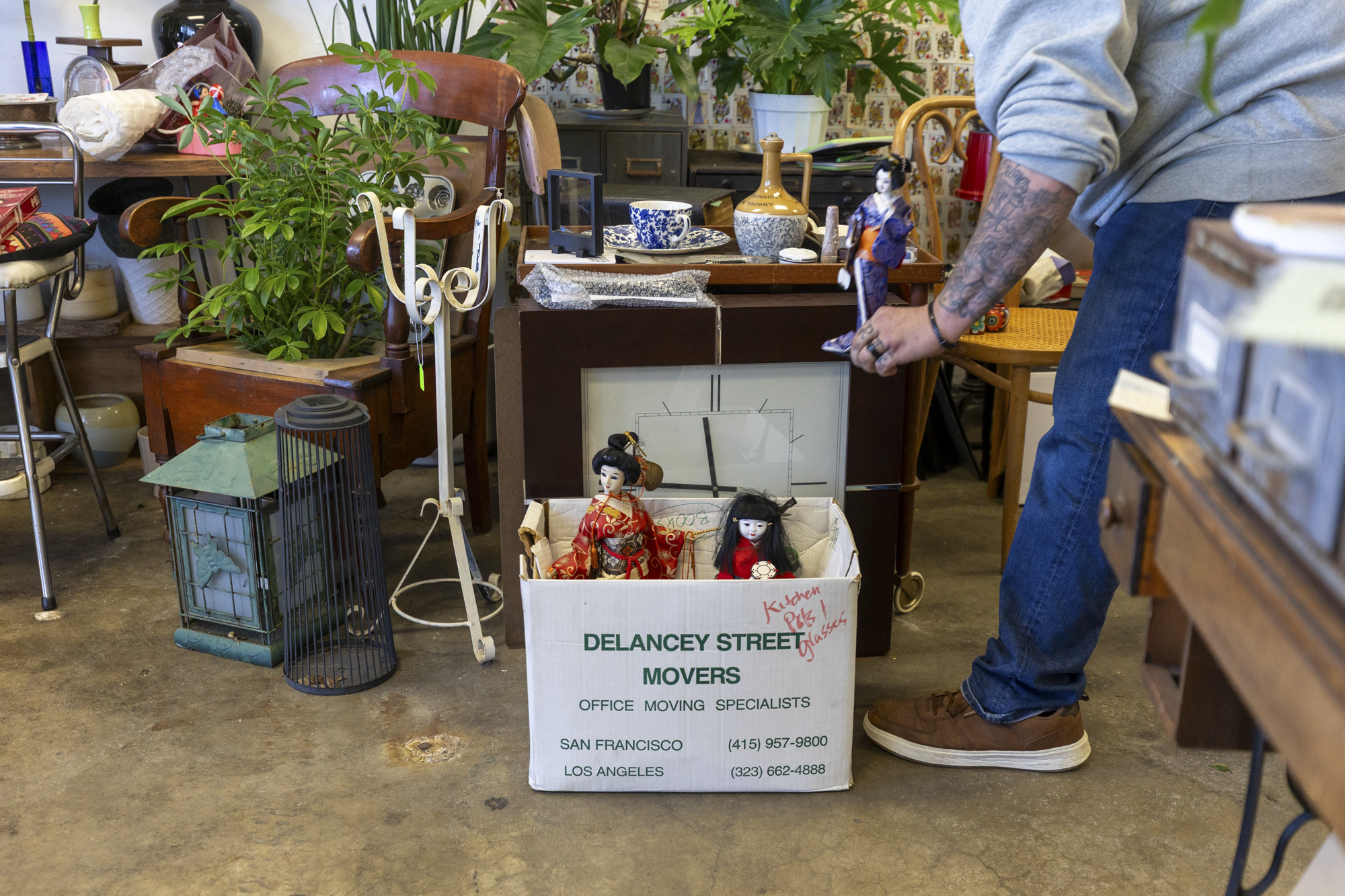 A customer places a doll into a box of vintage handmade dolls inside Free Oakland UP in Oakland on Jan. 24, 2026. (Gustavo Hernandez/KQED)