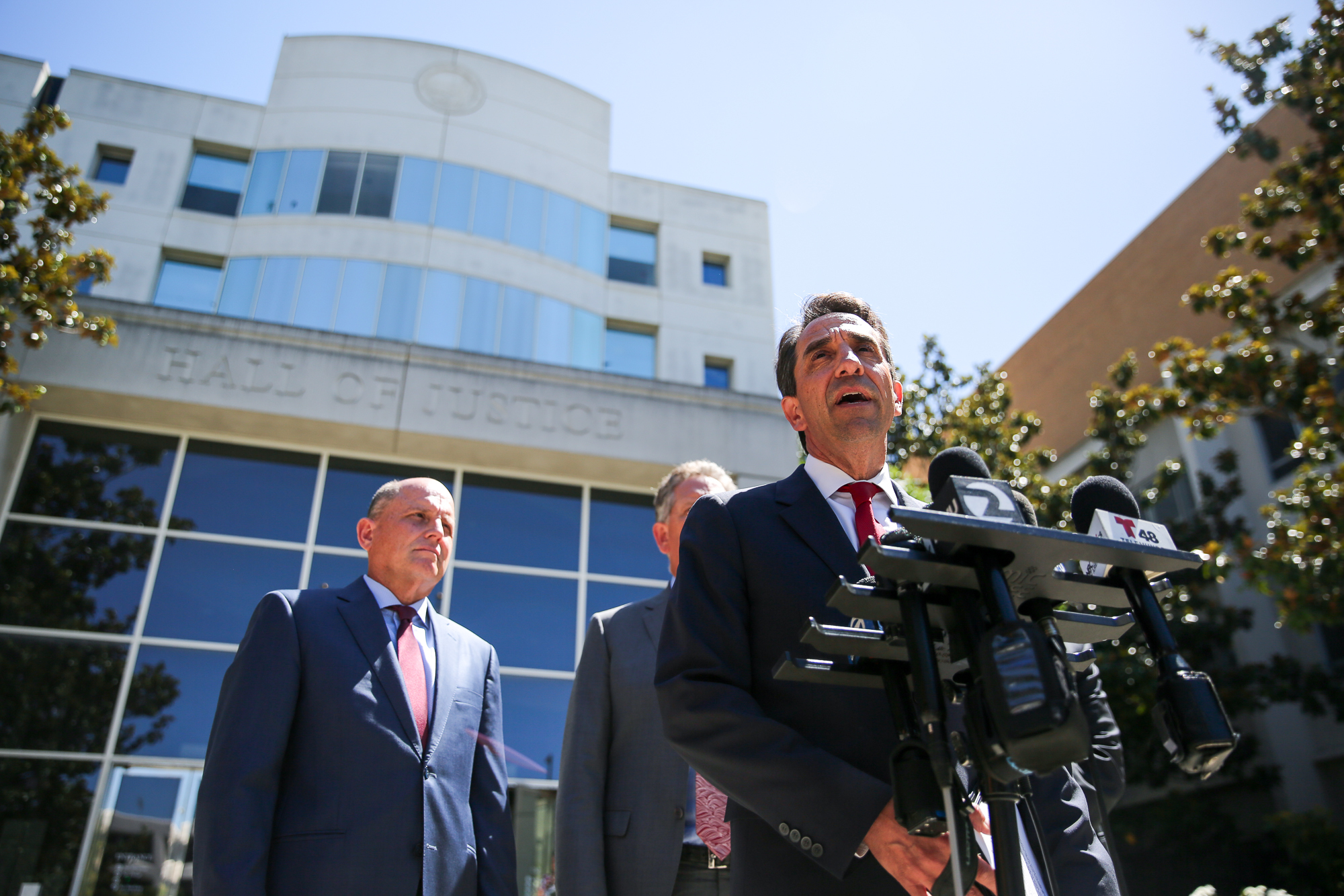 Santa Clara County District Attorney Jeff Rosen speaks to the press outside the Hall of Justice in San José about a new plea deal in the case against three corrections officers who fatally beat a mentally ill man. (Joseph Geha/KQED)