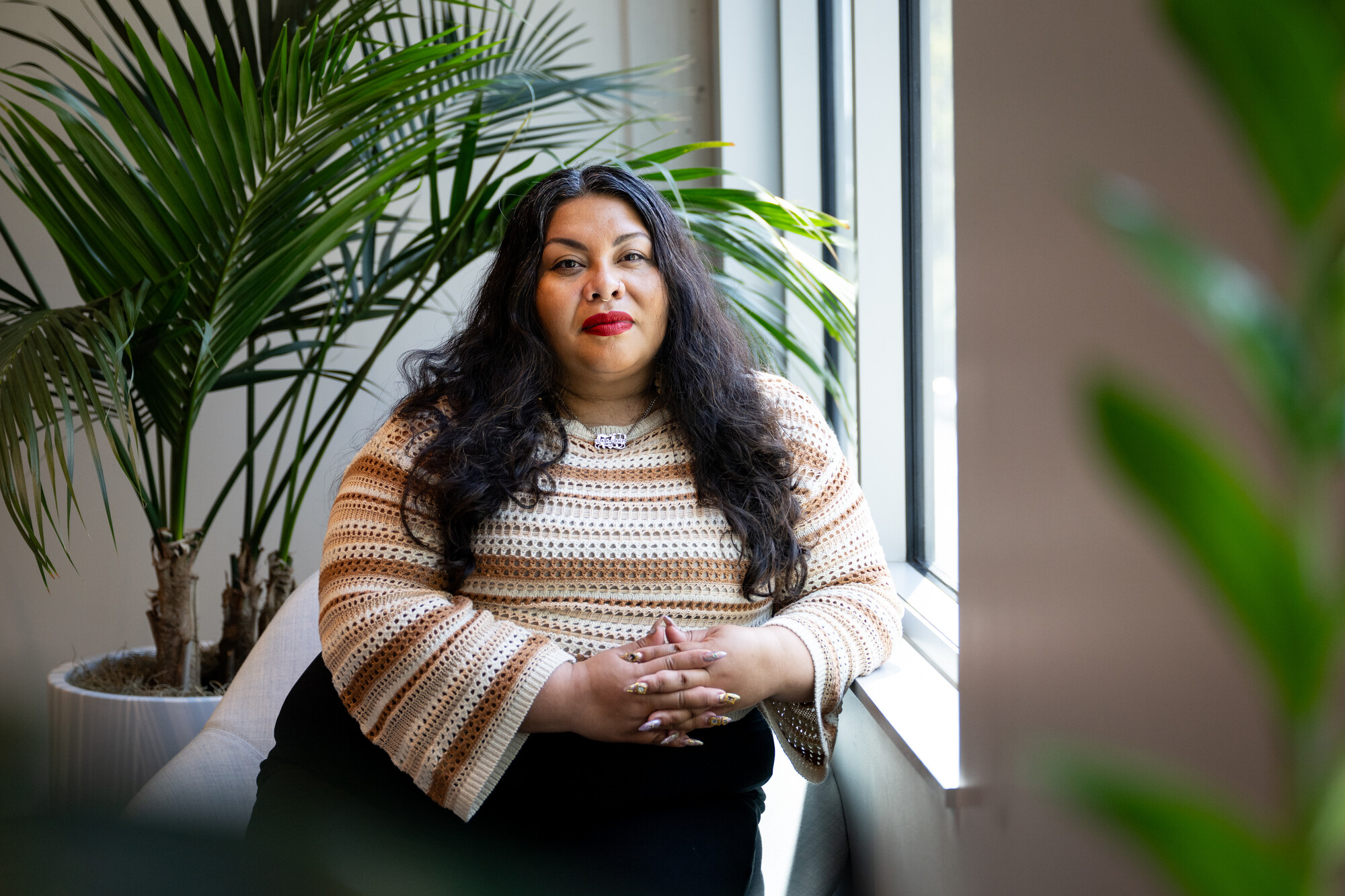 Victoria Duran, a high school teacher from East San José, poses for a photo at the KQED offices in San Francisco on April 6, 2026. (Beth LaBerge/KQED)