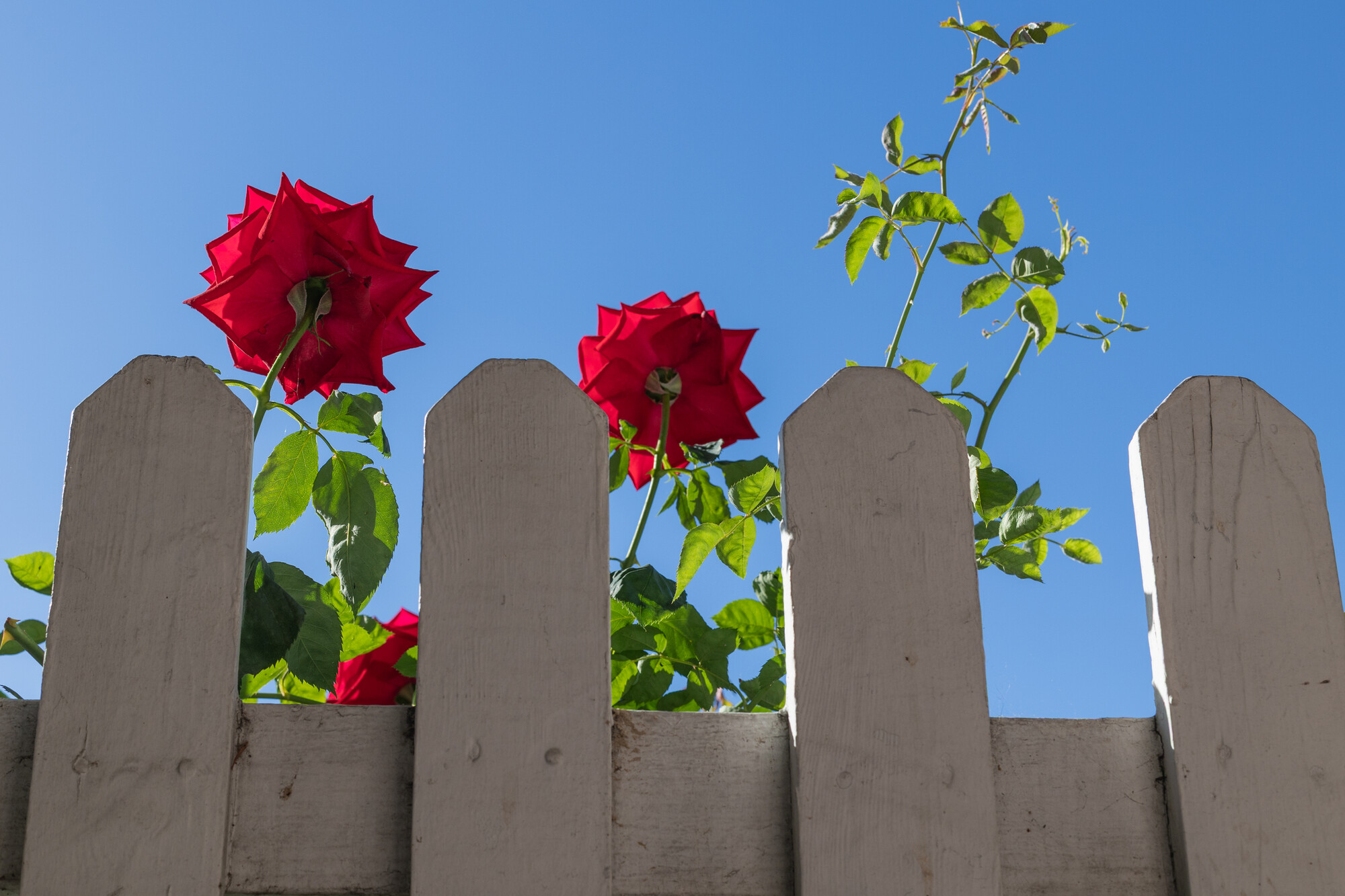 Red roses rise above a white picket fence in a garden at Cambrian Park Plaza on April 7, 2026, in San José. (Gustavo Hernandez/KQED)