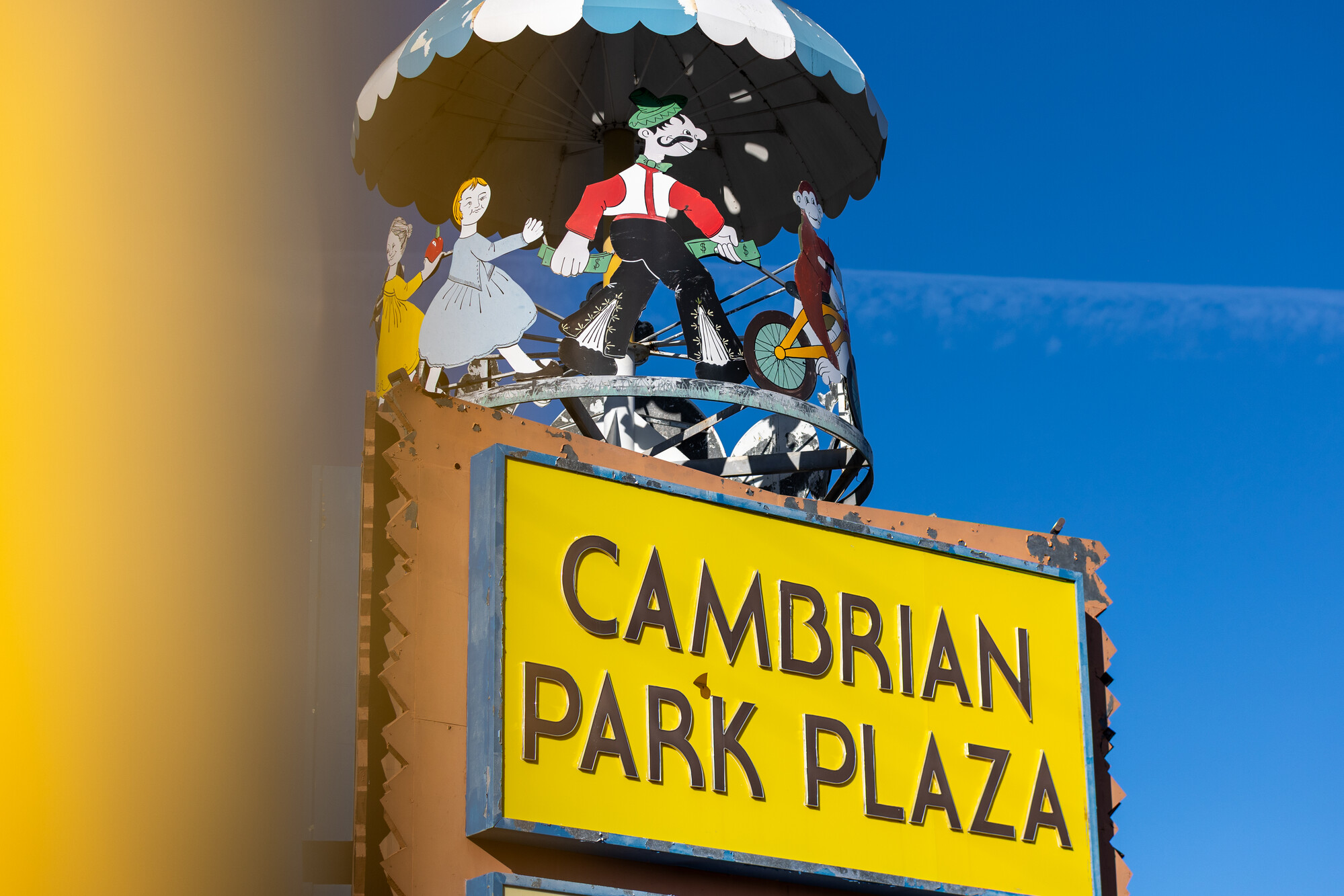 It’s big; it’s yellow; and it has a carousel on top, complete with playful figures encircling the outside. At one point, the carousel actually rotated — but like many things in this shopping plaza — it has seen better days.