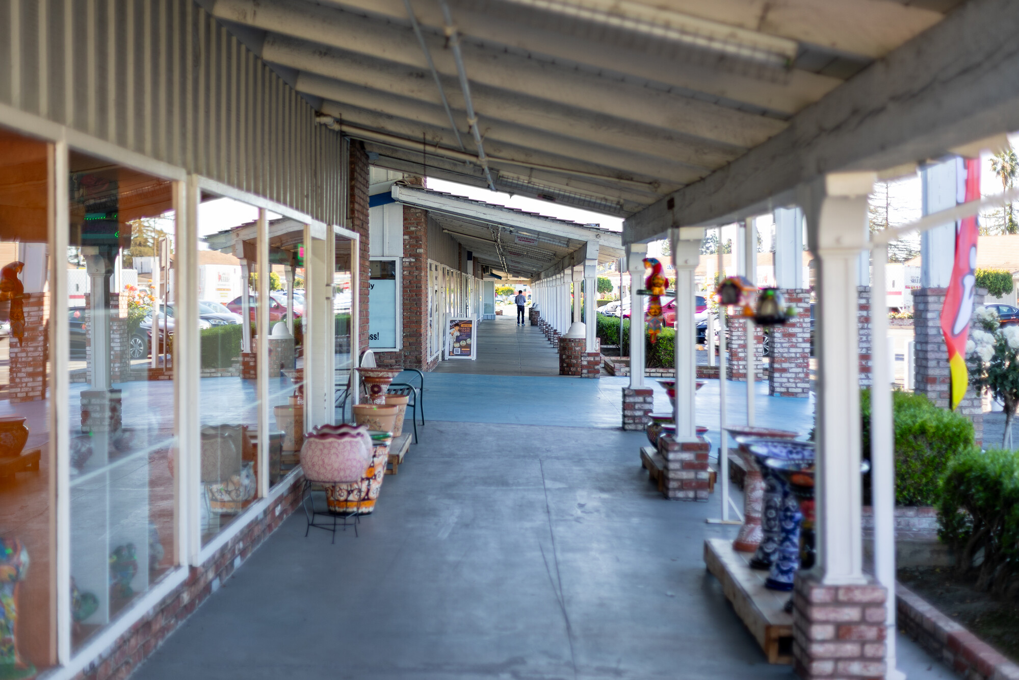 The plaza itself is low slung with a massive parking lot that is often empty. Storefronts are made of brick and nestle under a covered walkway. It’s not your average strip mall with a big grocery store at the center and smaller chains flanking it. Instead, there’s a bit more charm. Shops are clustered around little courtyards with white picket fences, picnic benches and trees. Some stores have window boxes with flowers. There are roses and palm trees. It’s quaint, but faded.