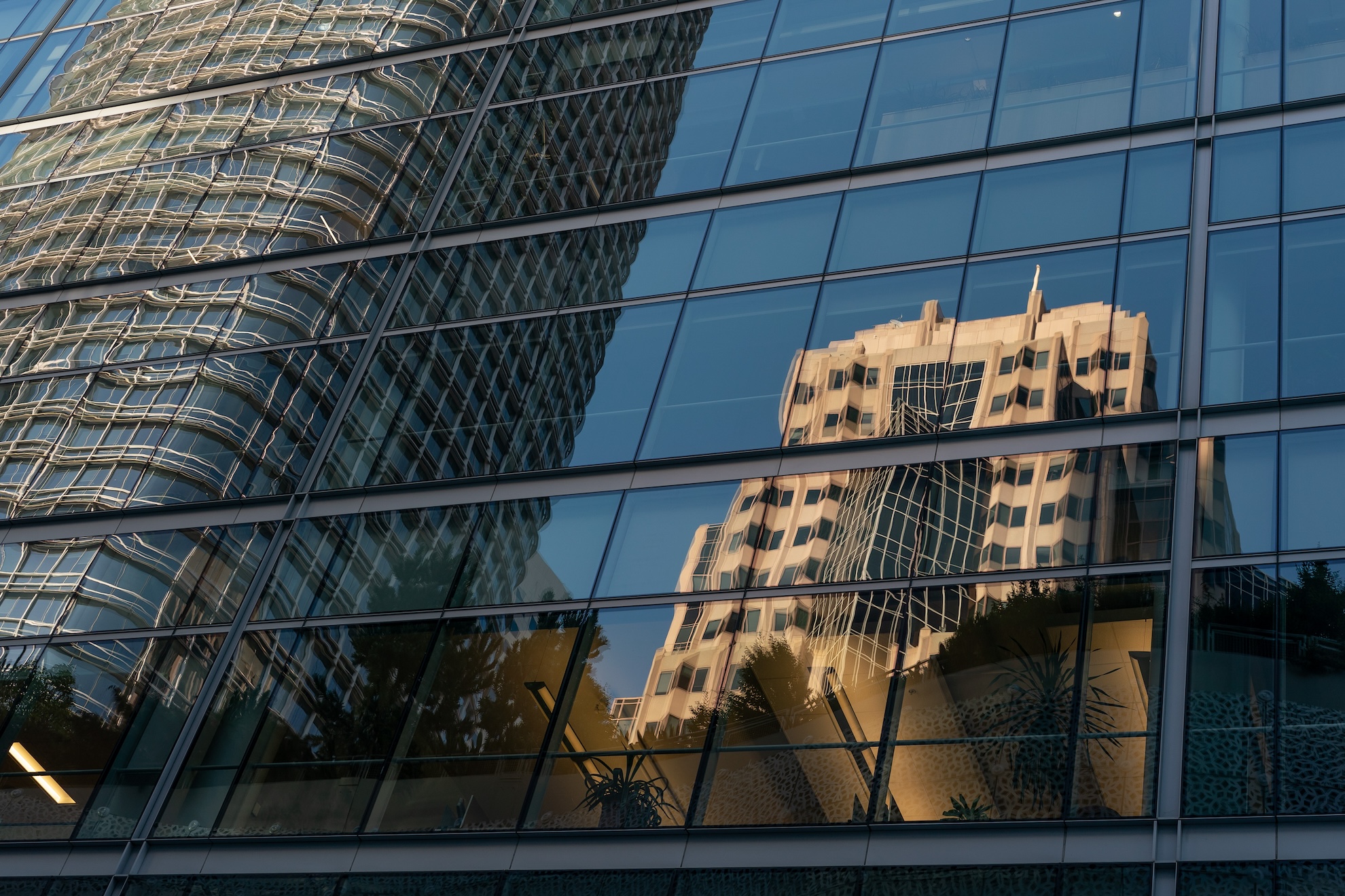 The Salesforce Tower is seen reflected in windows of 500 Howard Street, where AI firm Anthropic subleased Slack’s office, in downtown San Francisco, California on Oct. 19, 2023. (Loren Elliott for The Washington Post via Getty Images)