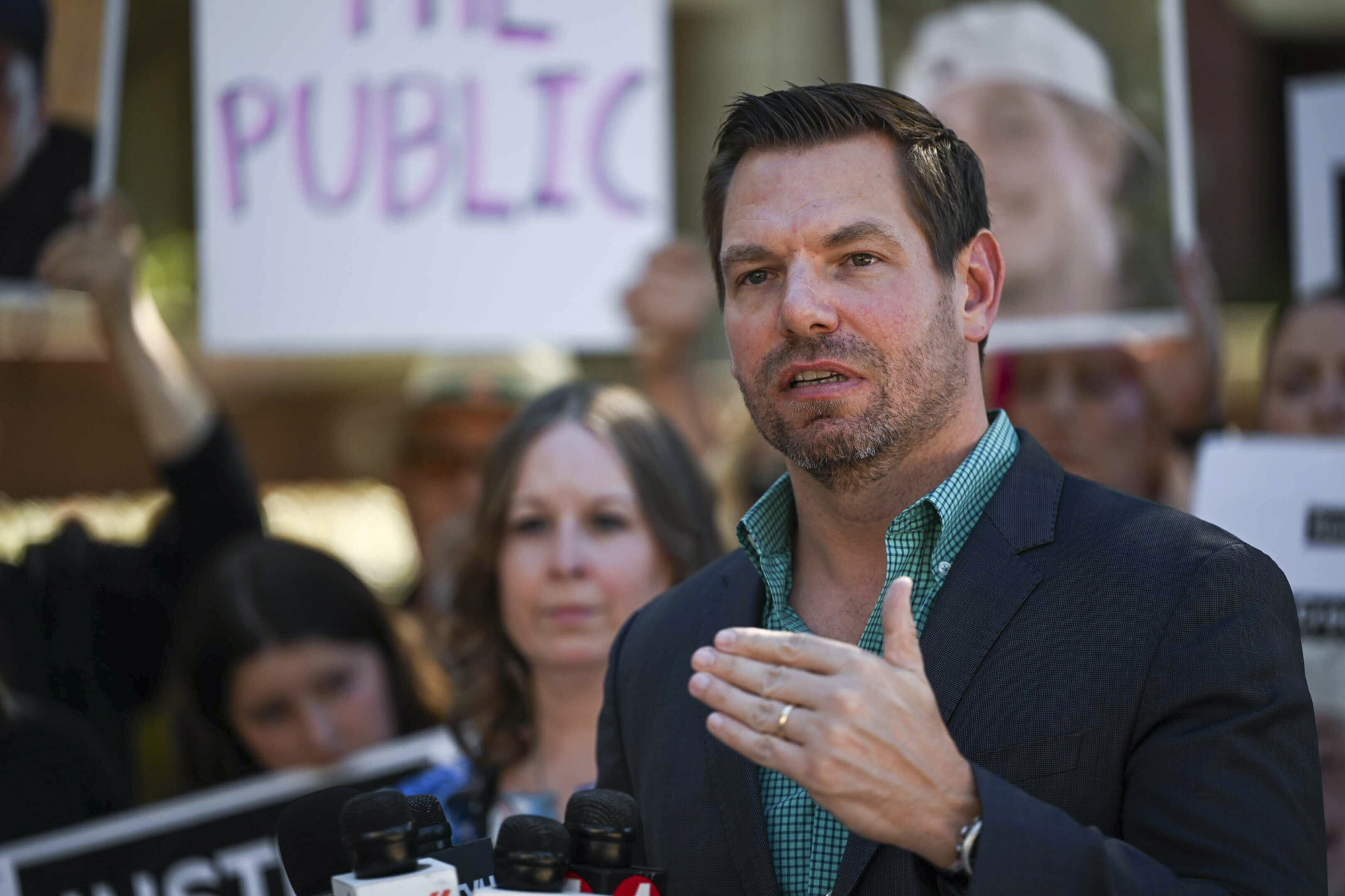 California gubernatorial candidate, Rep. Eric Swalwell, D-California, appears at a town hall meeting in Sacramento, California, on Tuesday, April 7, 2026. Following sexual assault and misconduct allegations, the East Bay congressman has ended his bid for governor and will leave the House.