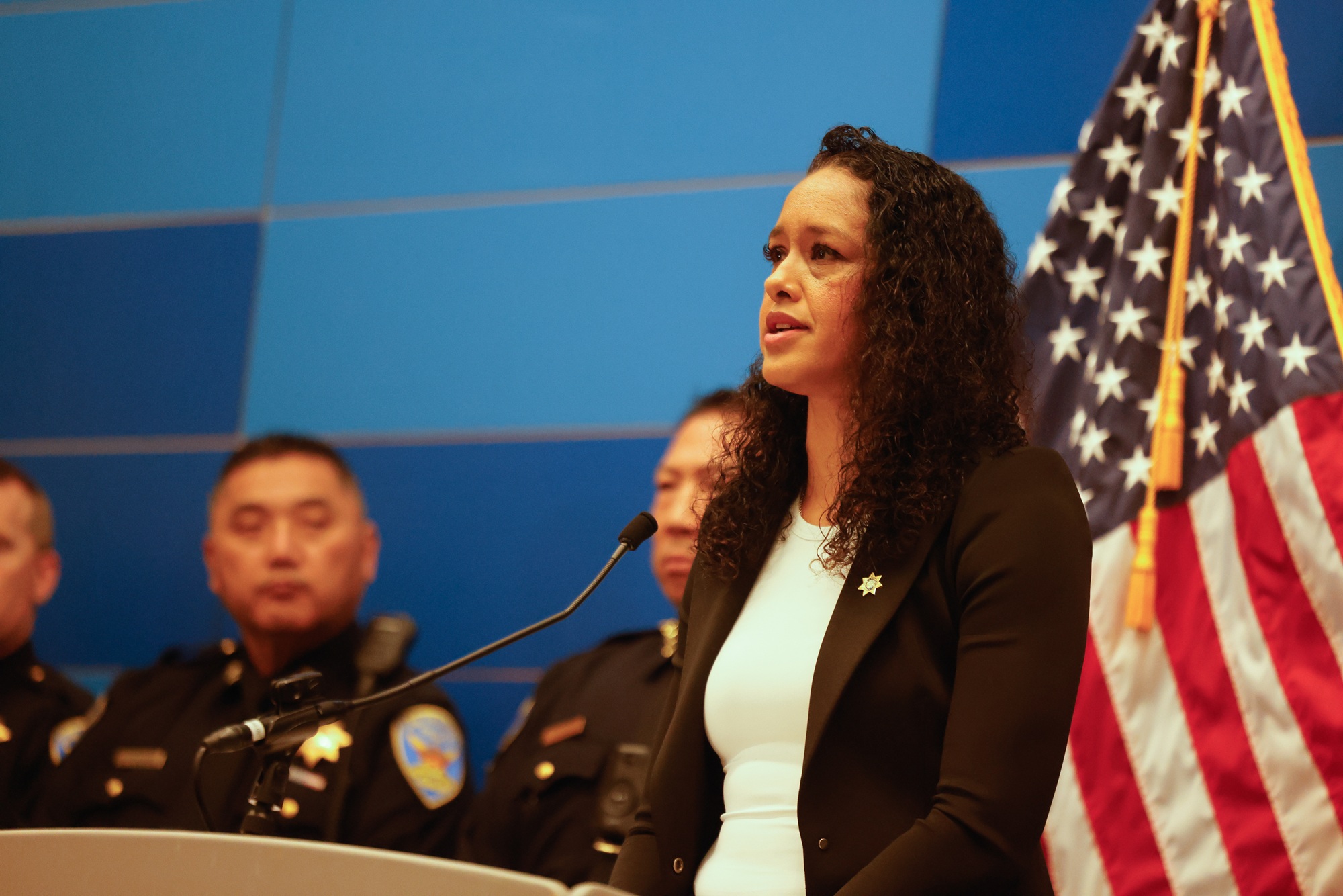 San Francisco District Attorney Brooke Jenkins speaks during a press conference where charges against the suspect in the OpenAI CEO Sam Altman mansion firebombing was announced at SFPD headquarters on Monday, April 13, 2026, in San Francisco. (Lea Suzuki/San Francisco Chronicle via Getty Images)