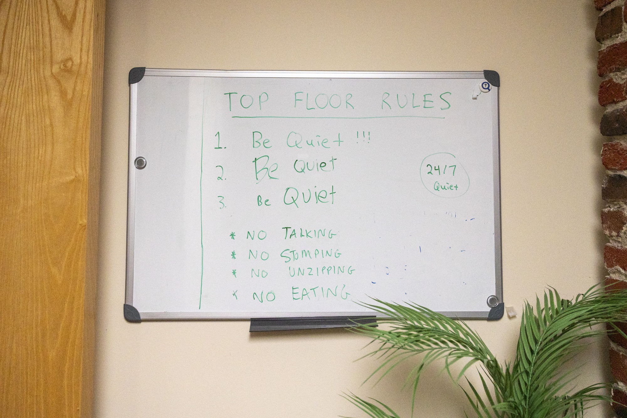 A dry-erase board displaying house rules is posted near the sleeping pod area at Brownstone on April 10, 2026, in San Francisco. (Gustavo Hernandez/KQED)