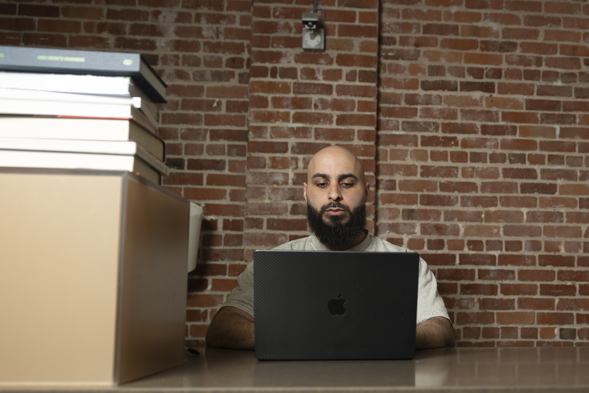Haseab Ullah, a resident, uses his laptop in the common area at Brownstone on April 10, 2026, in San Francisco. (Gustavo Hernandez/KQED)