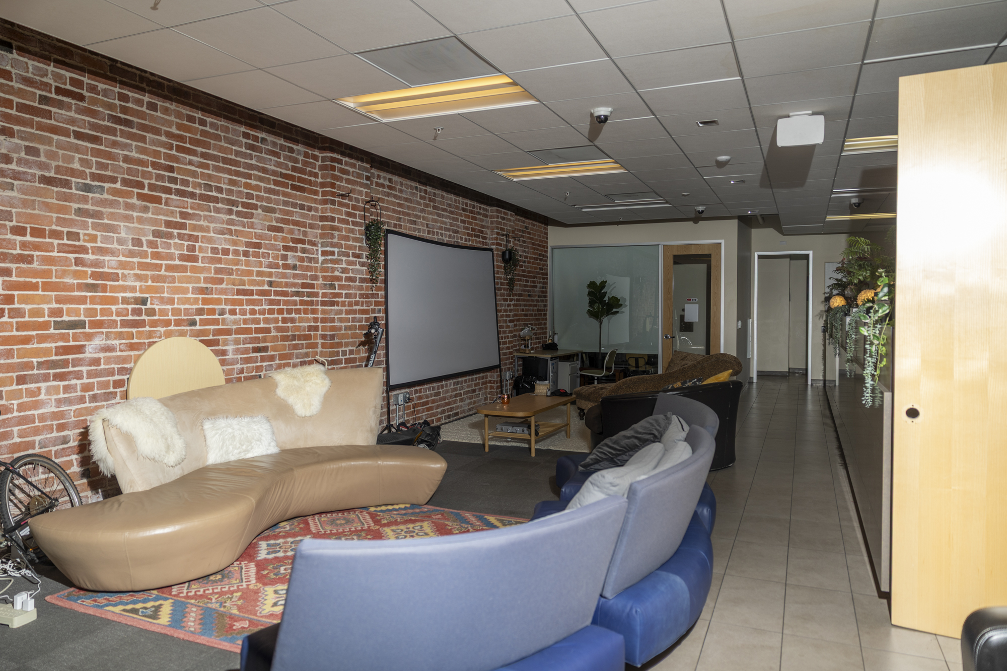 A common area with seating and a projector screen is seen inside Brownstone’s co-living space on April 10, 2026, in San Francisco. (Gustavo Hernandez/KQED)