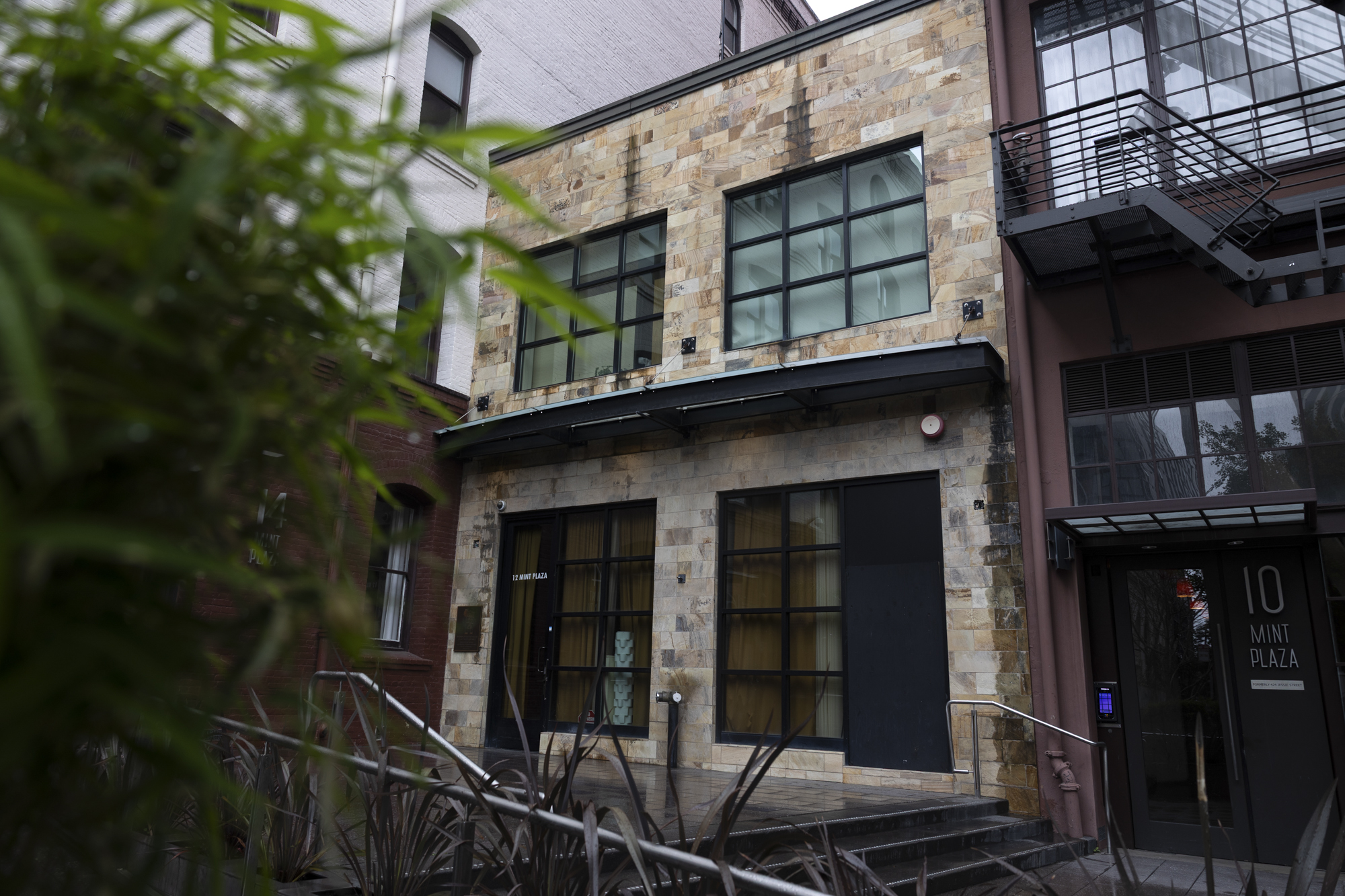 The exterior of 12 Mint Plaza, home to Brownstone’s pod-based co-living space, is seen on April 10, 2026, in San Francisco. (Gustavo Hernandez/KQED)